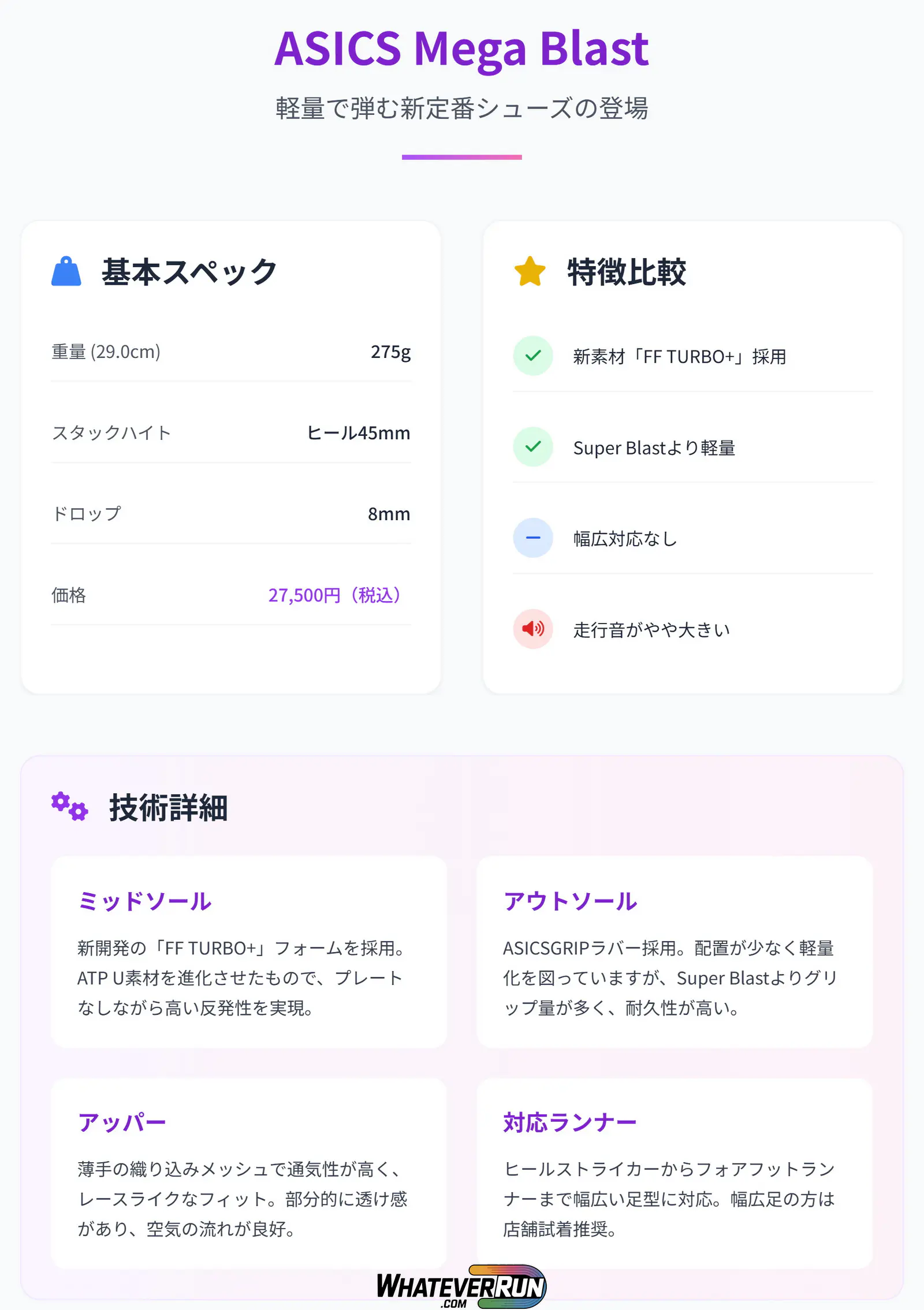 - カラー: Mega Blastはパープル/ピンクやホワイトの2色展開。スタイリッシュでモチベーションアップに寄与。