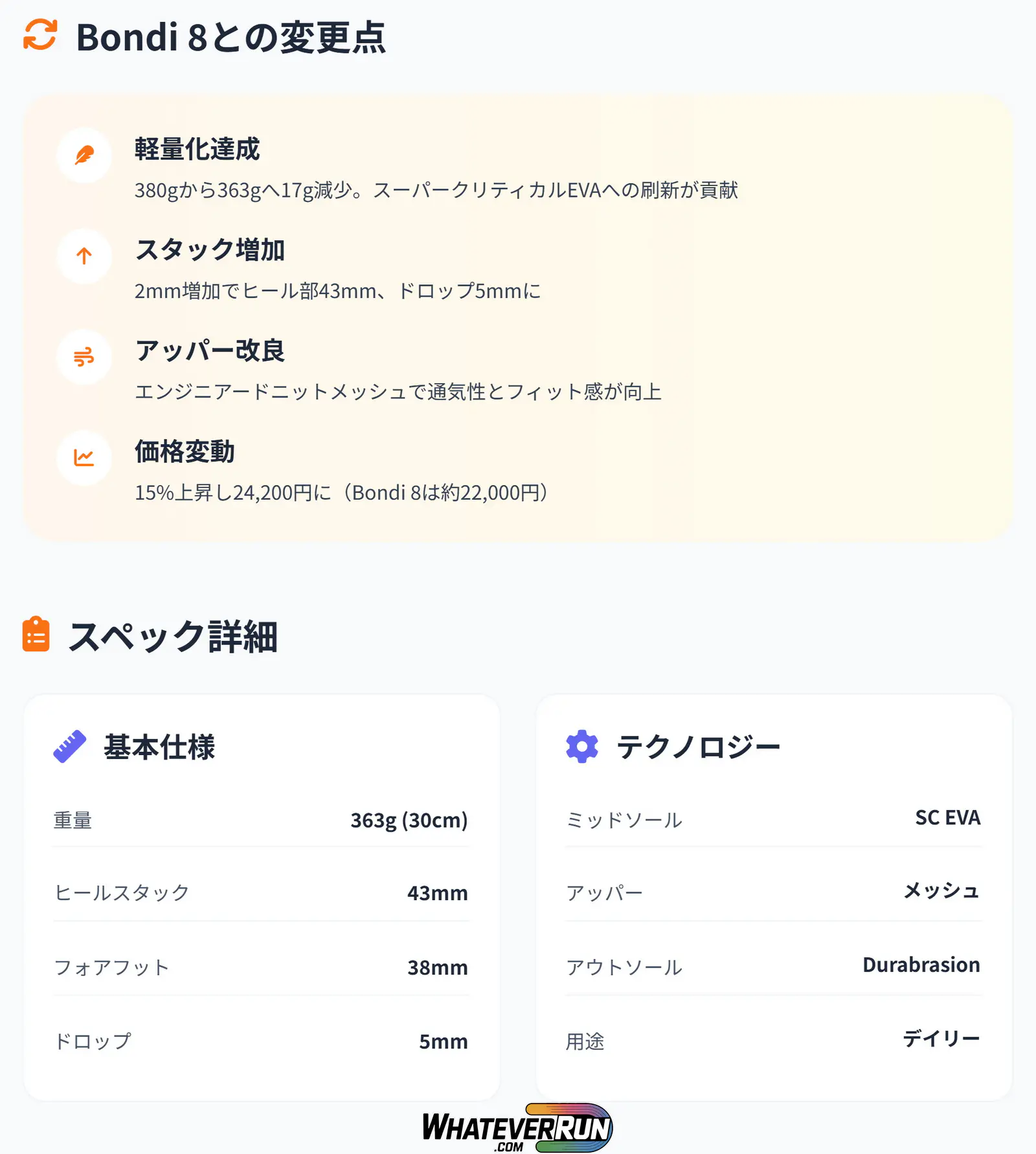 Bondi 9を前モデルや競合と比較します。以下は主なスペックをまとめた表です。重量は男性標準サイズUS9 (27cm) 基準の目安値を使用。
