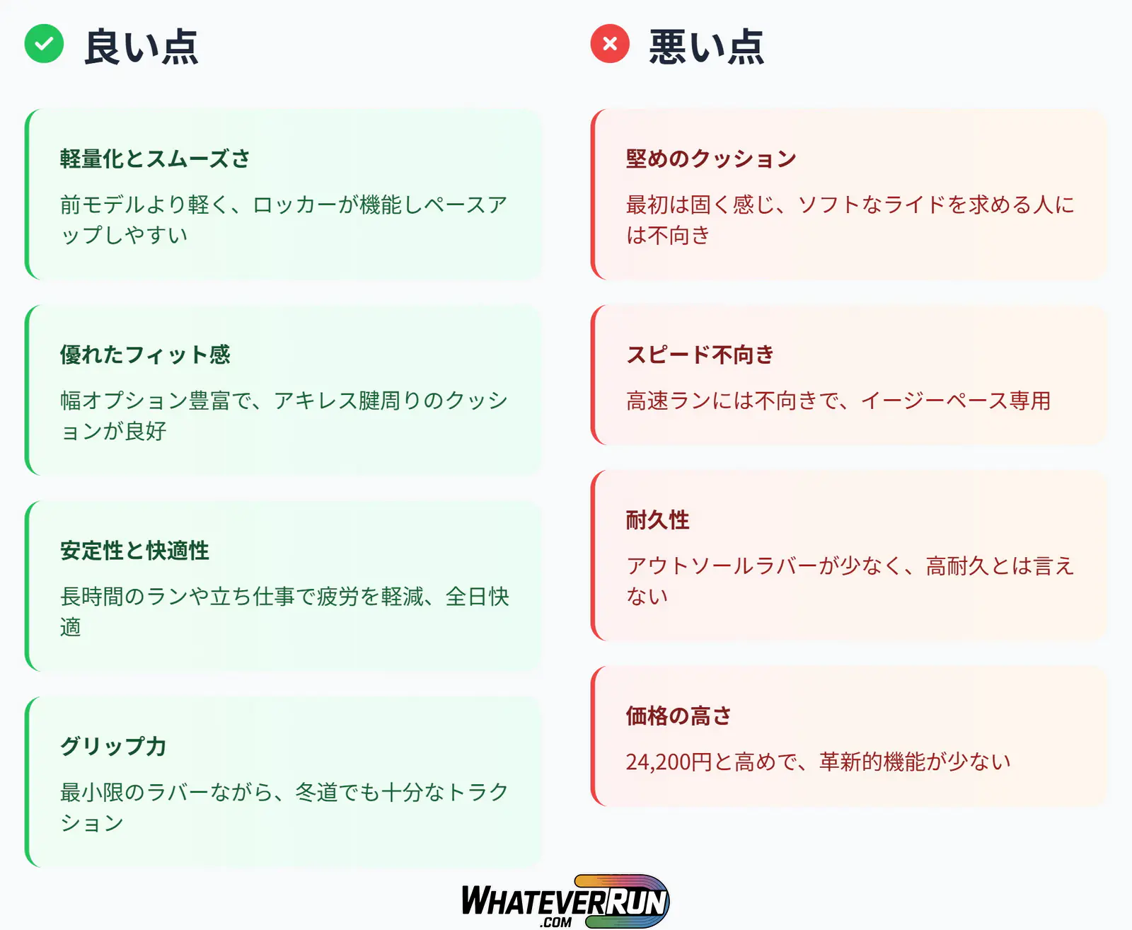 - 堅めのクッション: 最初は固く感じ、ソフトなマシュマロライドを求める人には不向き。時間とともに柔らかくなりますが、New Balance Moreのような即時の柔らかさはない。