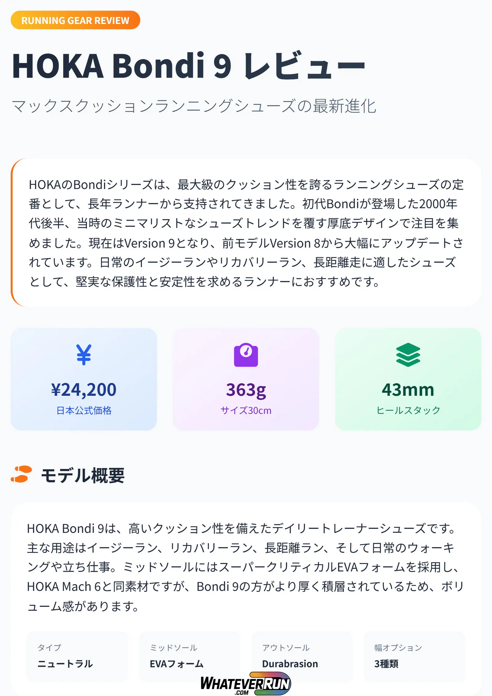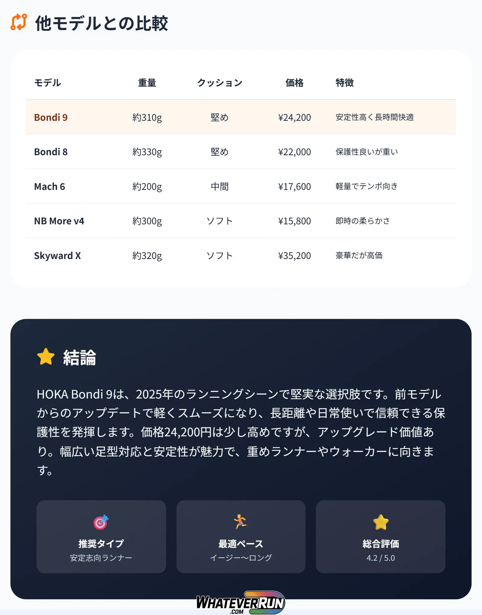 | HOKA Bondi 9 | 約310 | 堅め(保護重視) | 24,200 | 安定性高く、長時間快適。軽量化でスムーズ | 最初固く、スピード不向き |