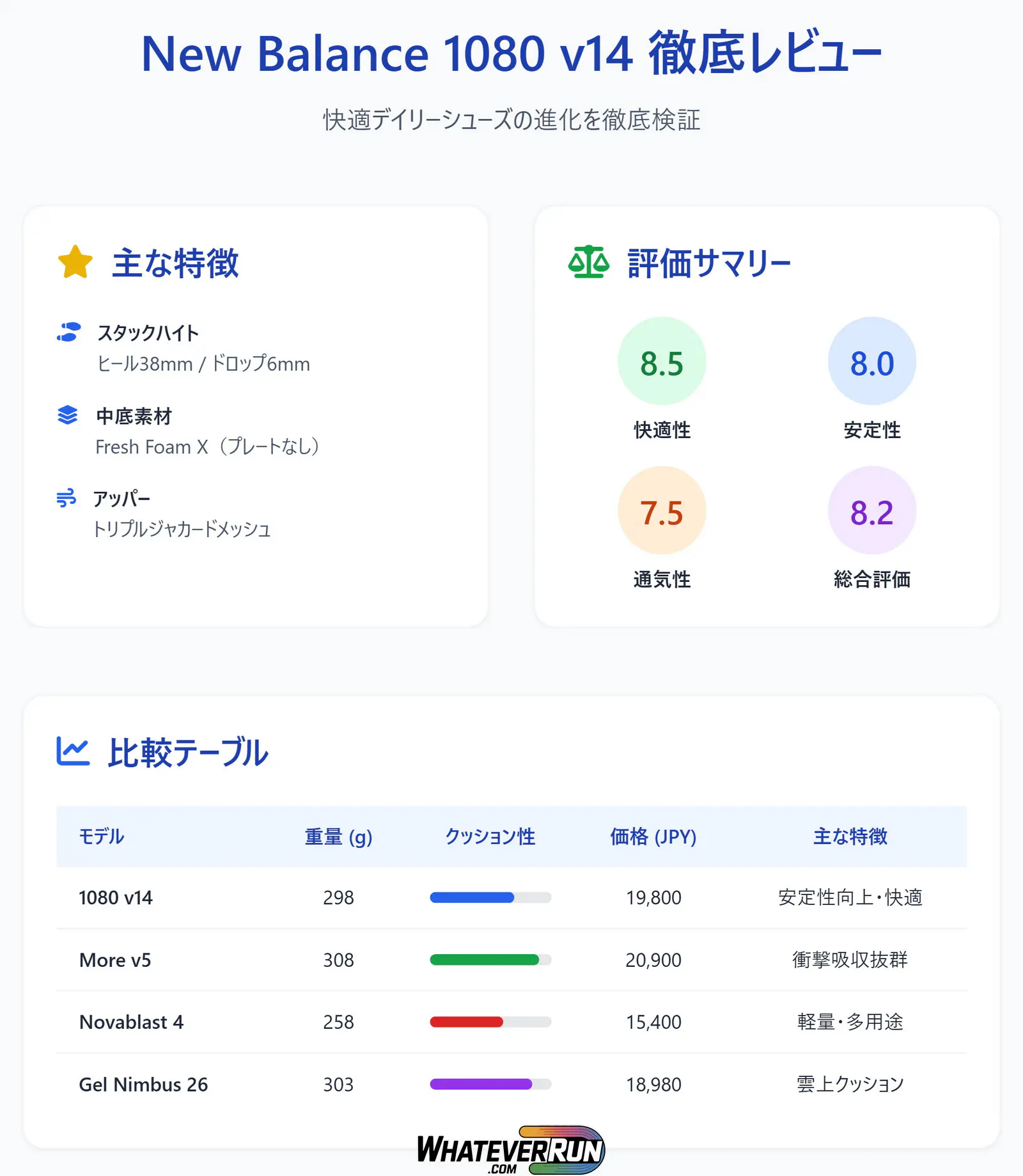 | New Balance 1080 v14 | 298 | 中程度軟らかめ | 19,800 | 安定性向上、快適、信頼性 | 重量増、熱こもり、速ペース不向き |
