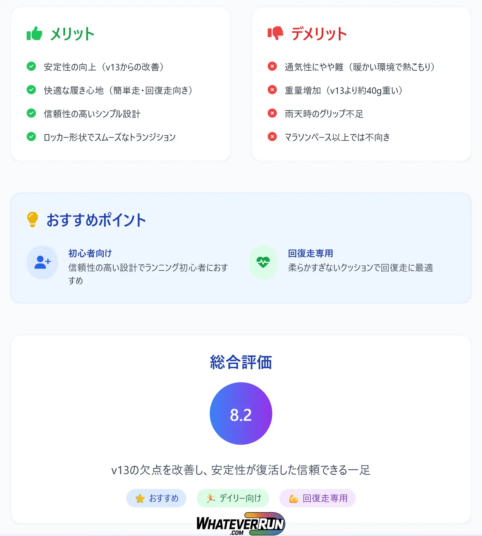 - 汎用性不足: マラソンペース以上では不向き。回復走専用に近い。