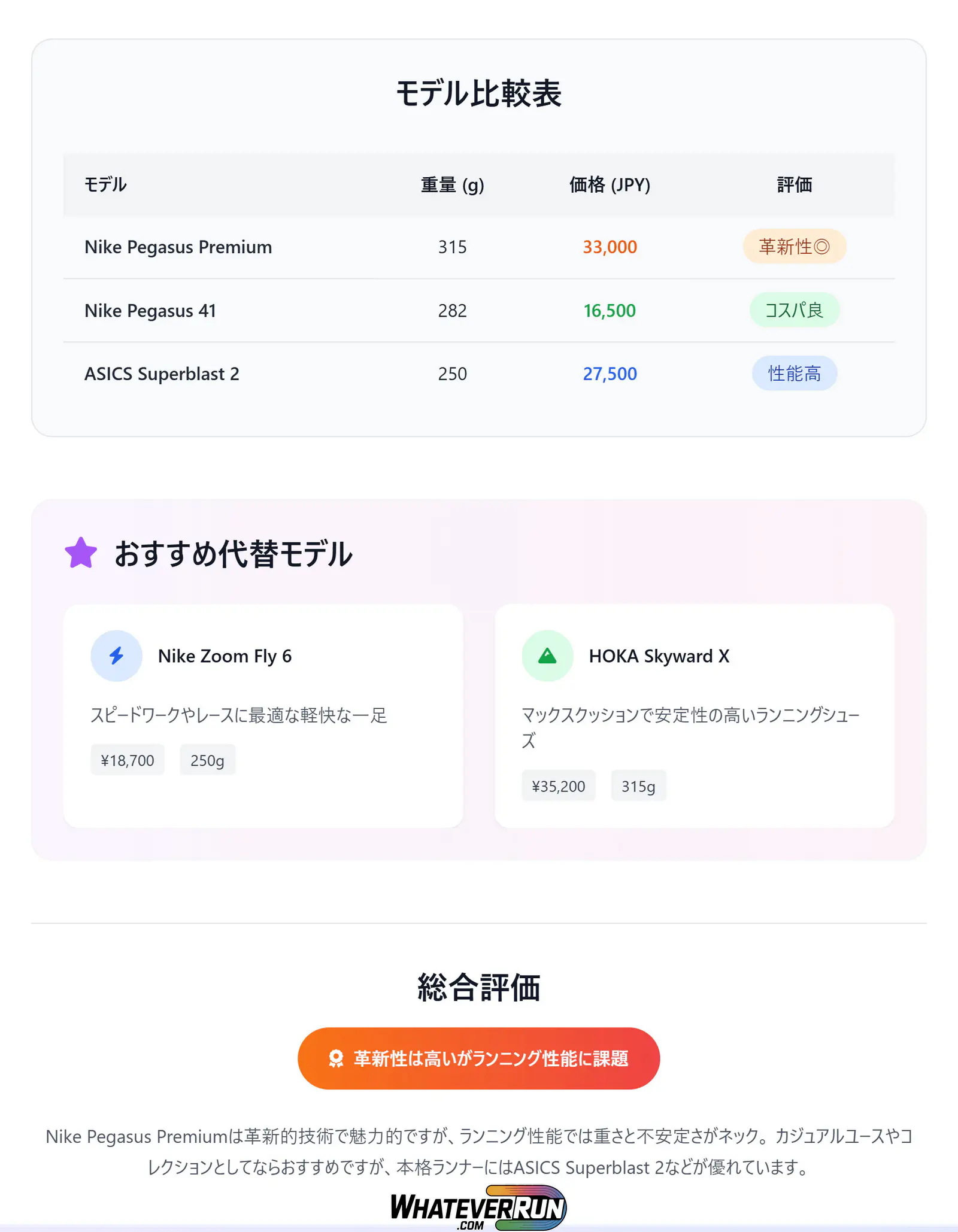 | Nike Pegasus Premium | 315 | 高 (ZoomX + Air Zoom + ReactX) | 33,000 | 快適歩行、ユニークデザイン | 重く不安定、高価 |