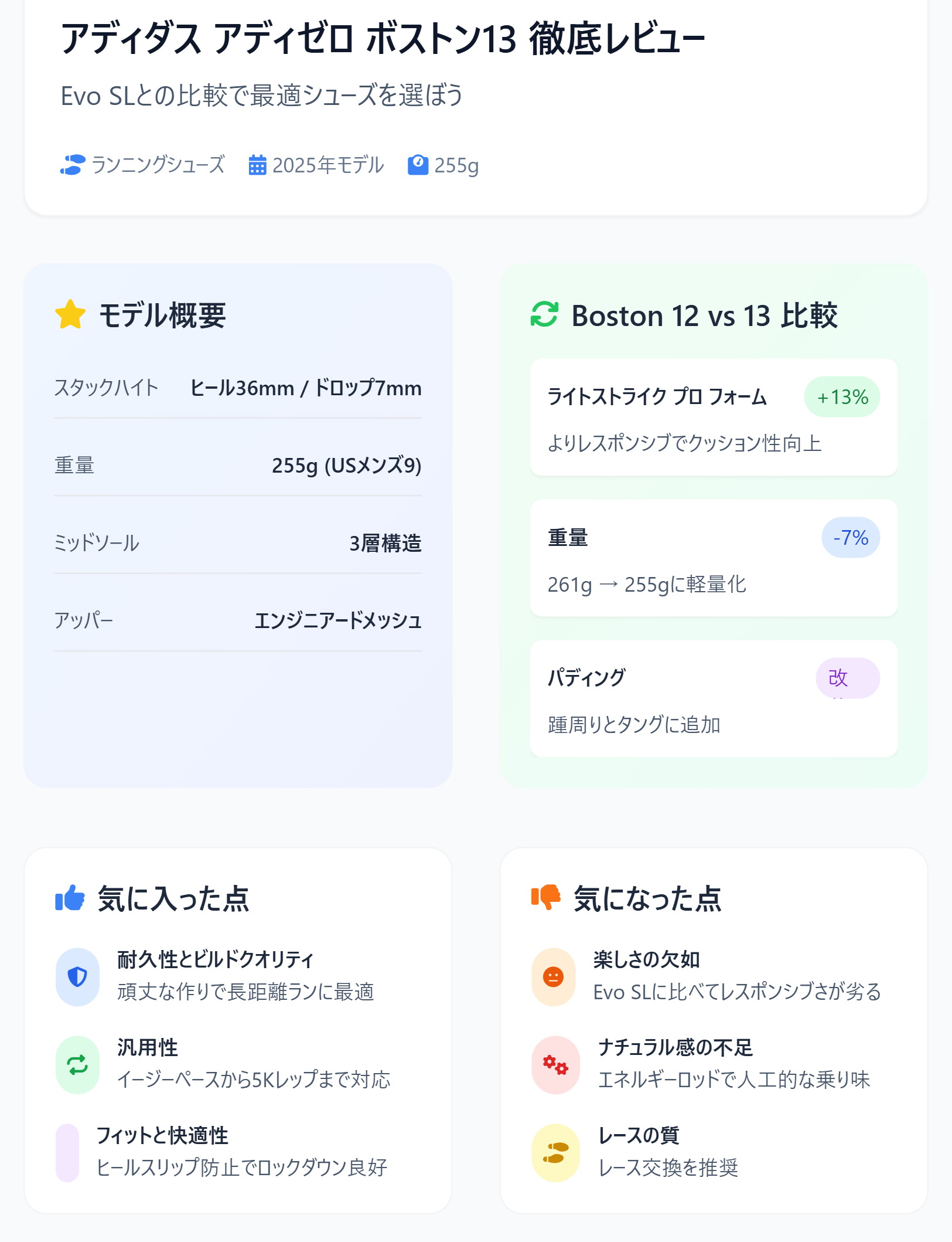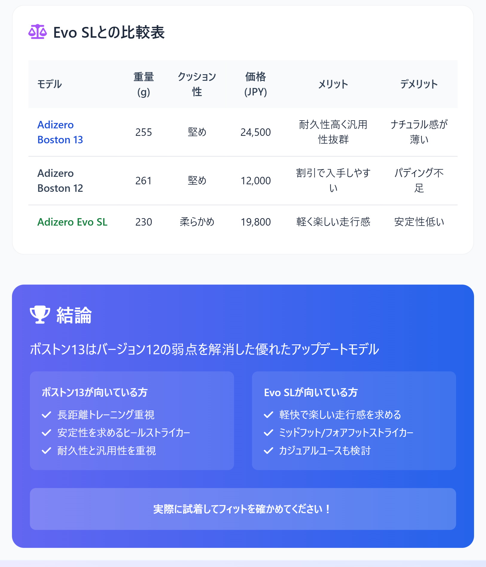 アディダス アディゼロ ボストン13は、バージョン12の弱点を解消した優れたアップデートモデル。耐久性、汎用性、安定性が魅力で、長距離トレーニングやレースに最適です。一方、Evo SLは軽快で楽しいシューズですが、安定性を求めるならボストン13をおすすめ。予算があればボストン13を、スマイル重視ならEvo SLを。どちらも価値ある選択肢です。あなたはどちらを選びますか?実際に試着してフィットを確かめてください。