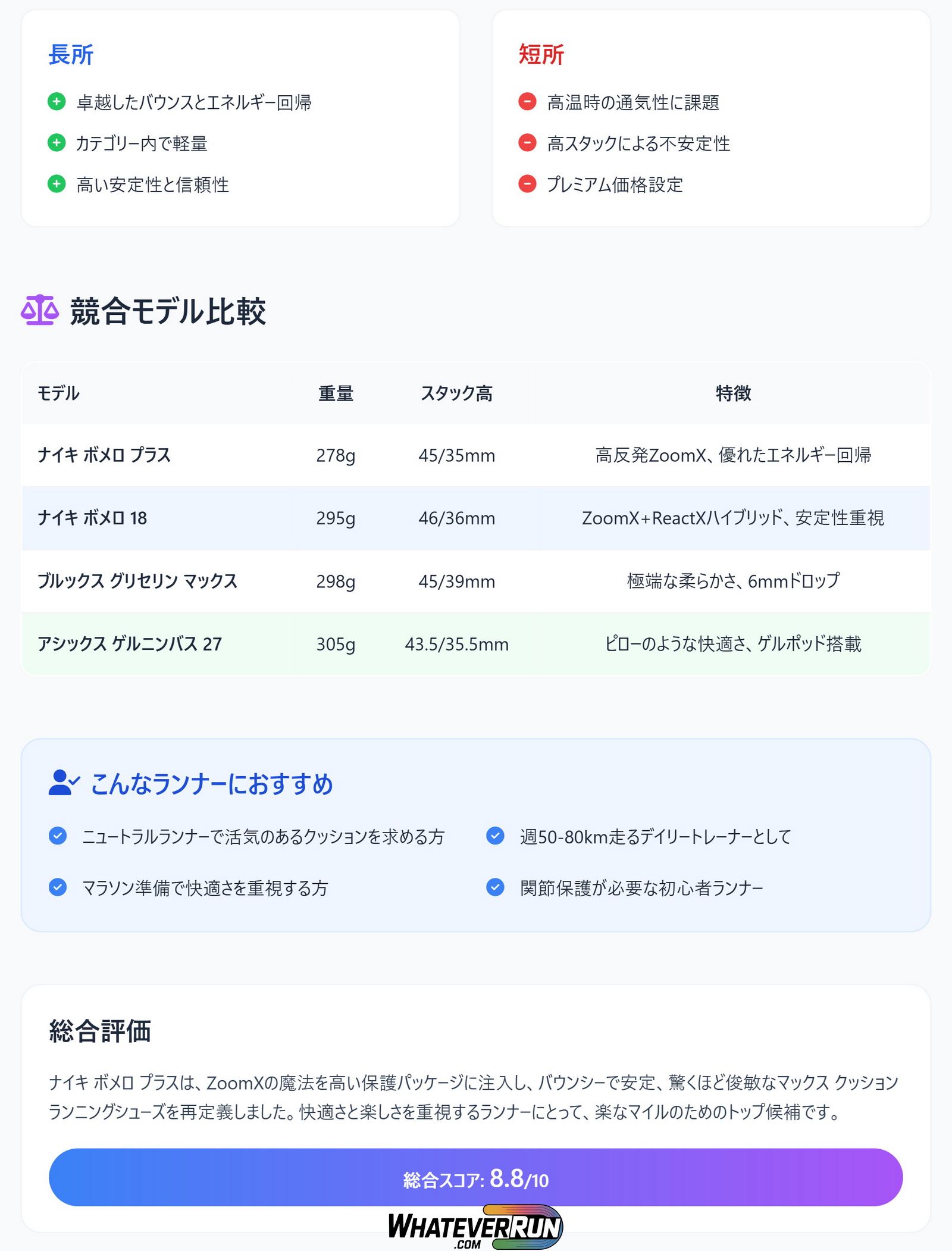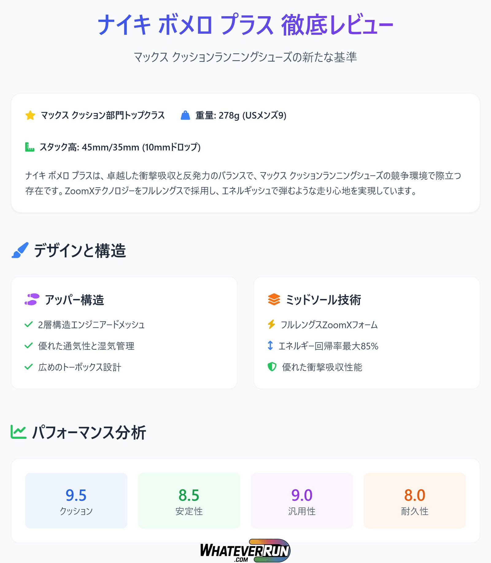 | ナイキ ボメロ プラス | 45/35 | 10mm | 278g (9.8 oz) | フルZoomXフォーム | 日常トレーニング、バウンスのあるロングラン |