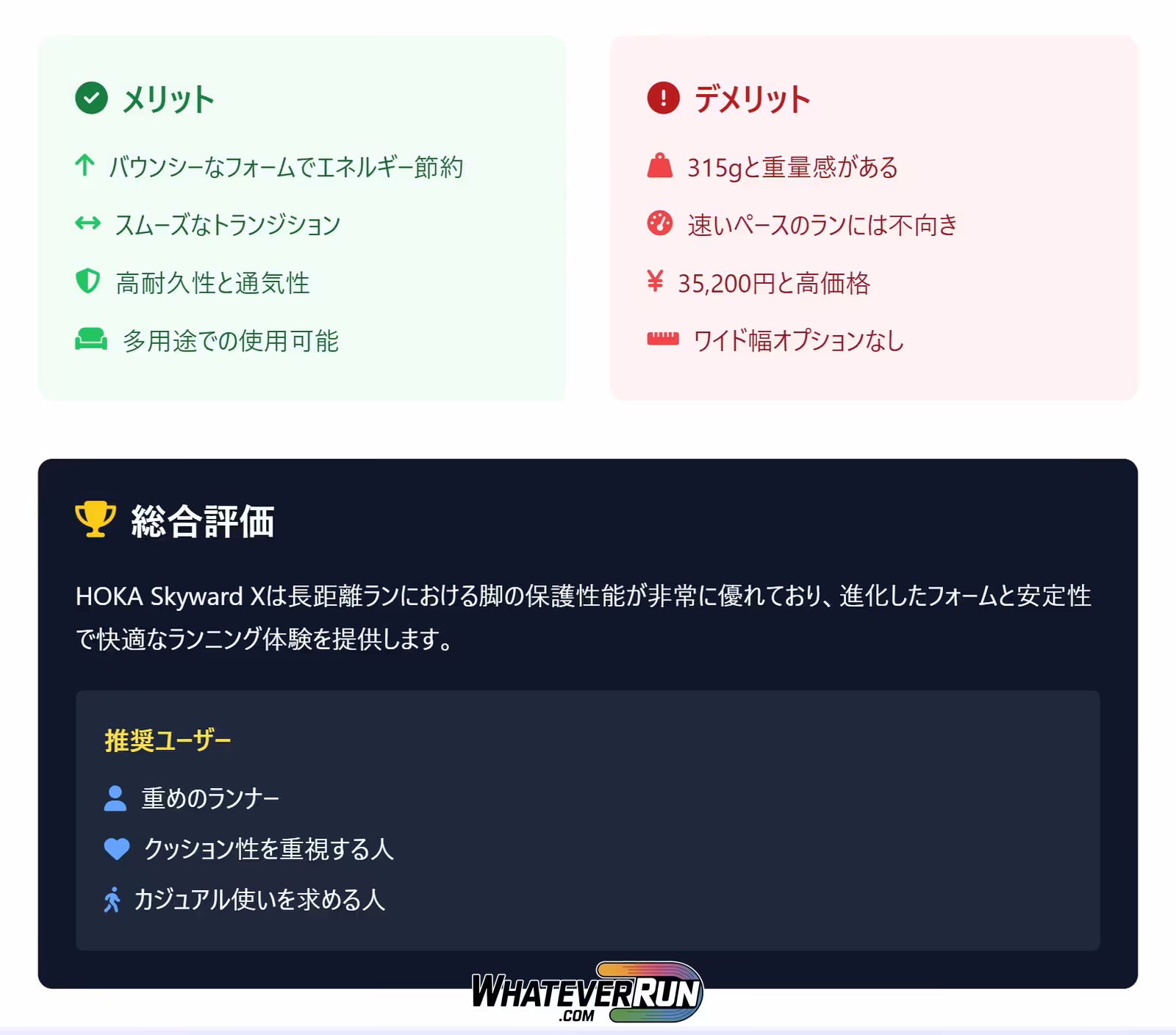 HOKA Skyward Xは、長距離ランで脚を守る優れたシューズです。進化したフォームと安定性がBondi Xの欠点を克服し、楽しく快適な体験を提供します。ただし、重量と価格が課題で、速いランには向きません。重めのランナーやクッション重視の人、またはカジュアル使いを求める人にオススメです。あなたのランニングスタイルに合えば、最高の相棒になるでしょう。どのシューズを選びますか?コメントでシェアしてください。