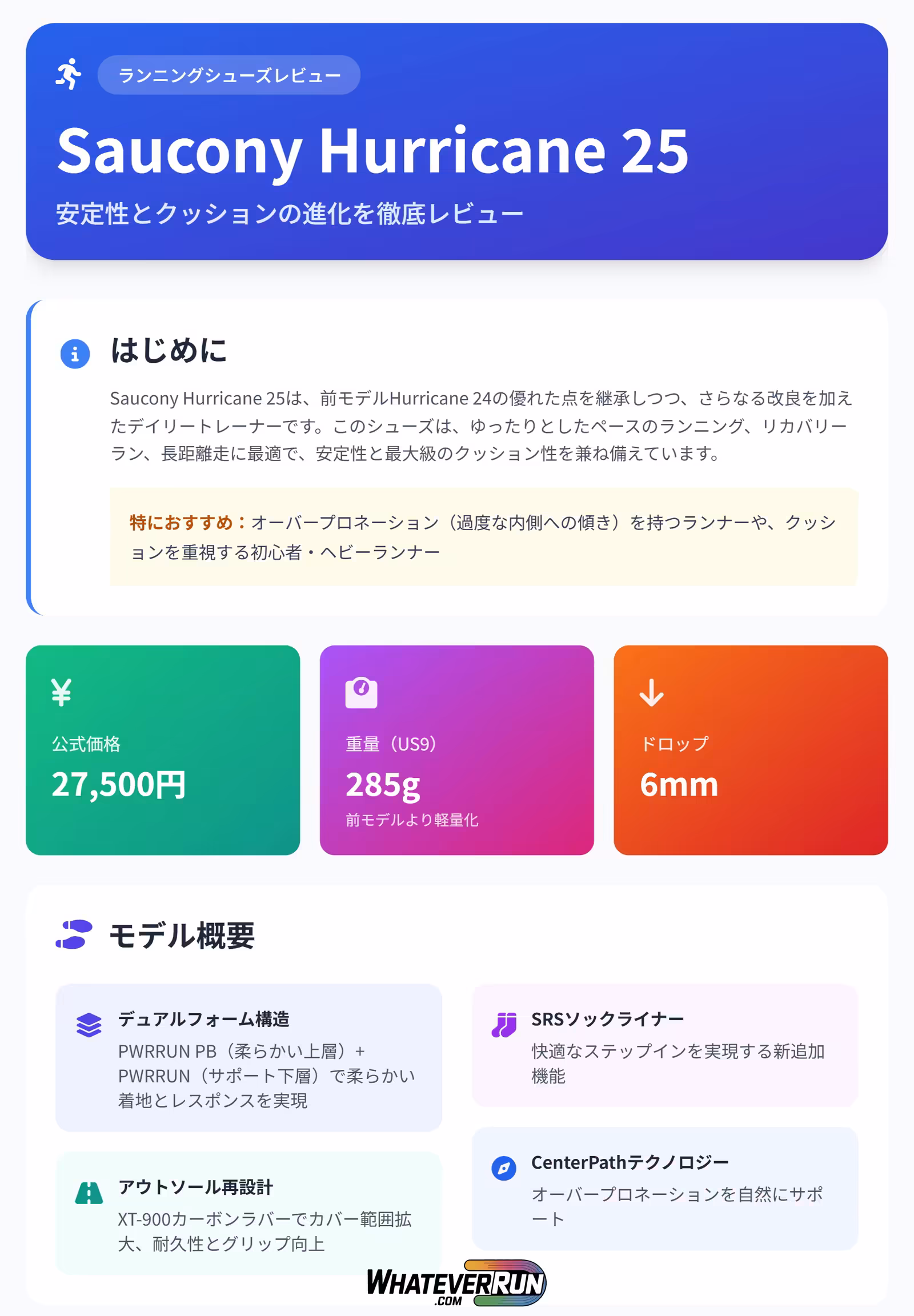 Saucony Hurricane 25は、最大クッションの安定シューズとして位置づけられます。価格は27,500円で、重量はメンズUS9(27cm)で285gと、前モデルより軽くなりました。ヒールからトゥへのドロップは6mmで、ミッドソールはPWRRUN PB(柔らかくバウンシーな上層)とPWRRUN(サポート力のある下層)のデュアル構造を採用。これにより、柔らかい着地とレスポンシブなトゥオフを実現します。