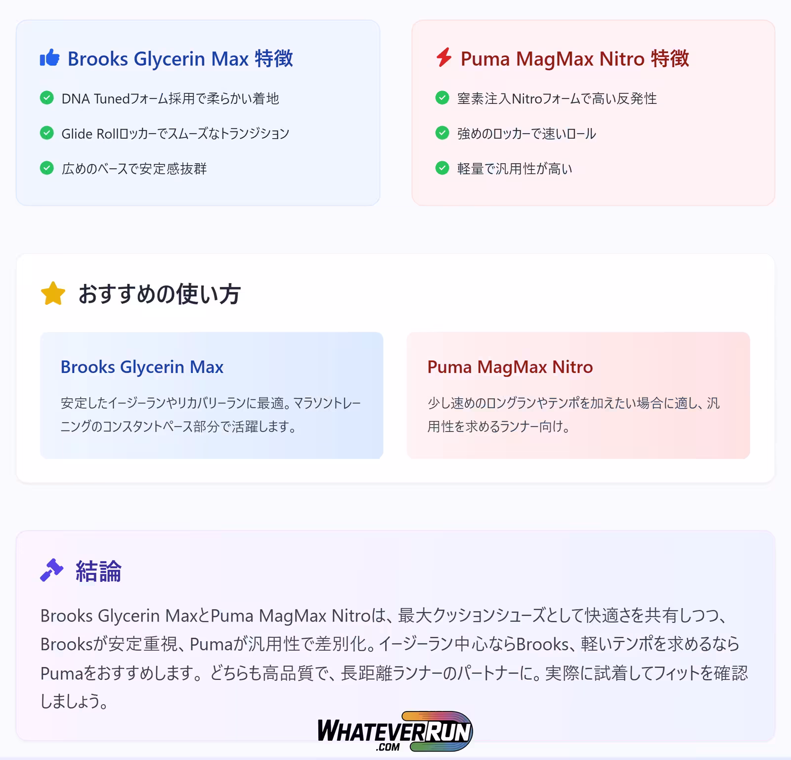 Brooks Glycerin Maxは、安定したイージーランやリカバリーランを求める人に最適。マラソントレーニングのコンスタントペース部分で活躍します。一方、Puma MagMax Nitroは少し速めのロングランやテンポを加えたい場合に適し、汎用性を求めるランナー向け。