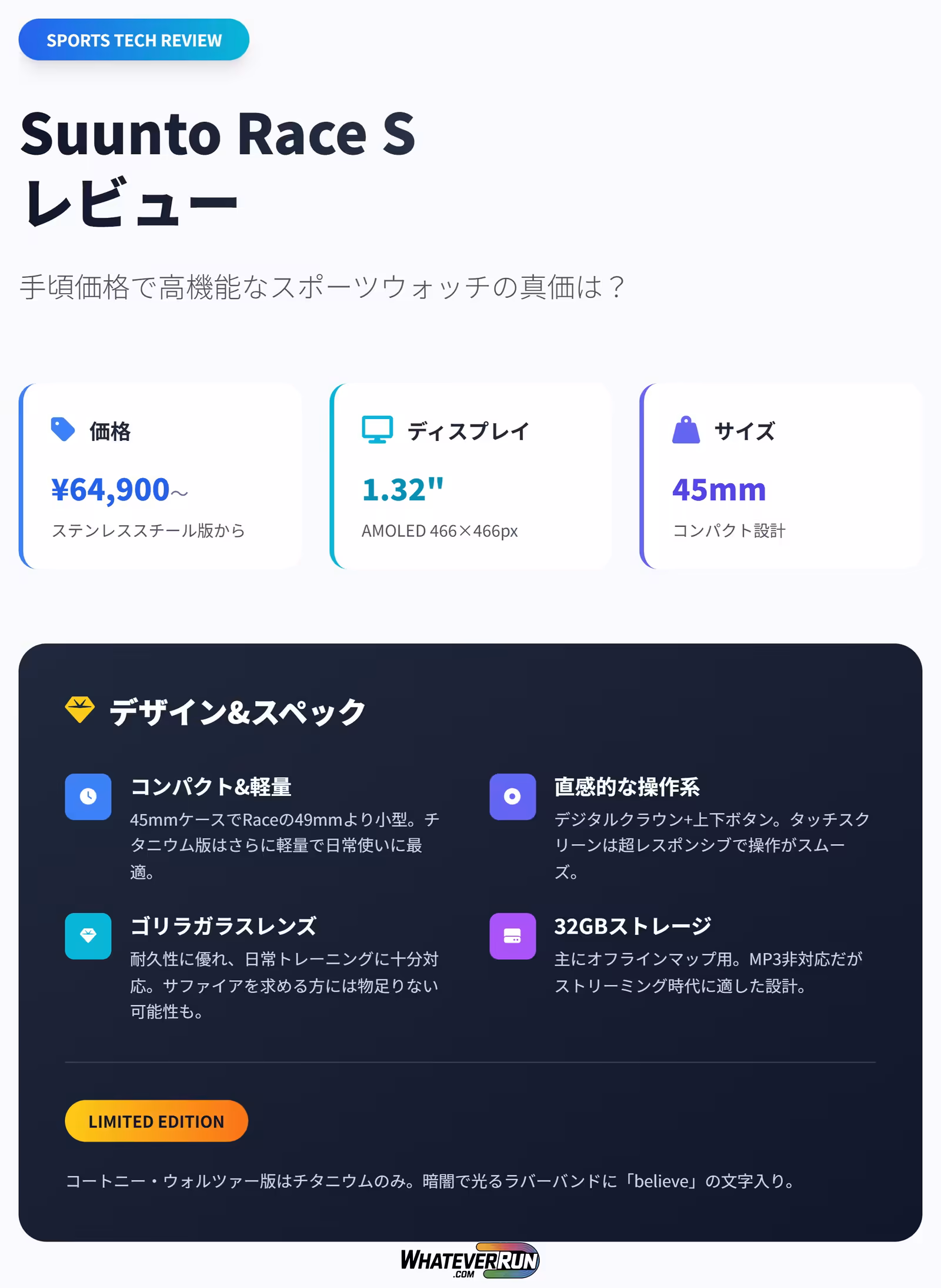 Suunto Race Sは、45mmのコンパクトサイズでアスリート向けに設計されたスポーツウォッチです。ステンレススチールモデルが64,900円、チタニウムモデルが70,566円という競争力のある価格で、AMOLEDディスプレイ、オフラインマップ、トレーニングメトリクスなどの豊富な機能を備えています。この記事では、動画レビューに基づき、その価値と性能を詳しく検証します。ゴリラガラスレンズを採用し、耐久性も十分ですが、サファイアガラスを求めるユーザーには物足りないかも知れません。