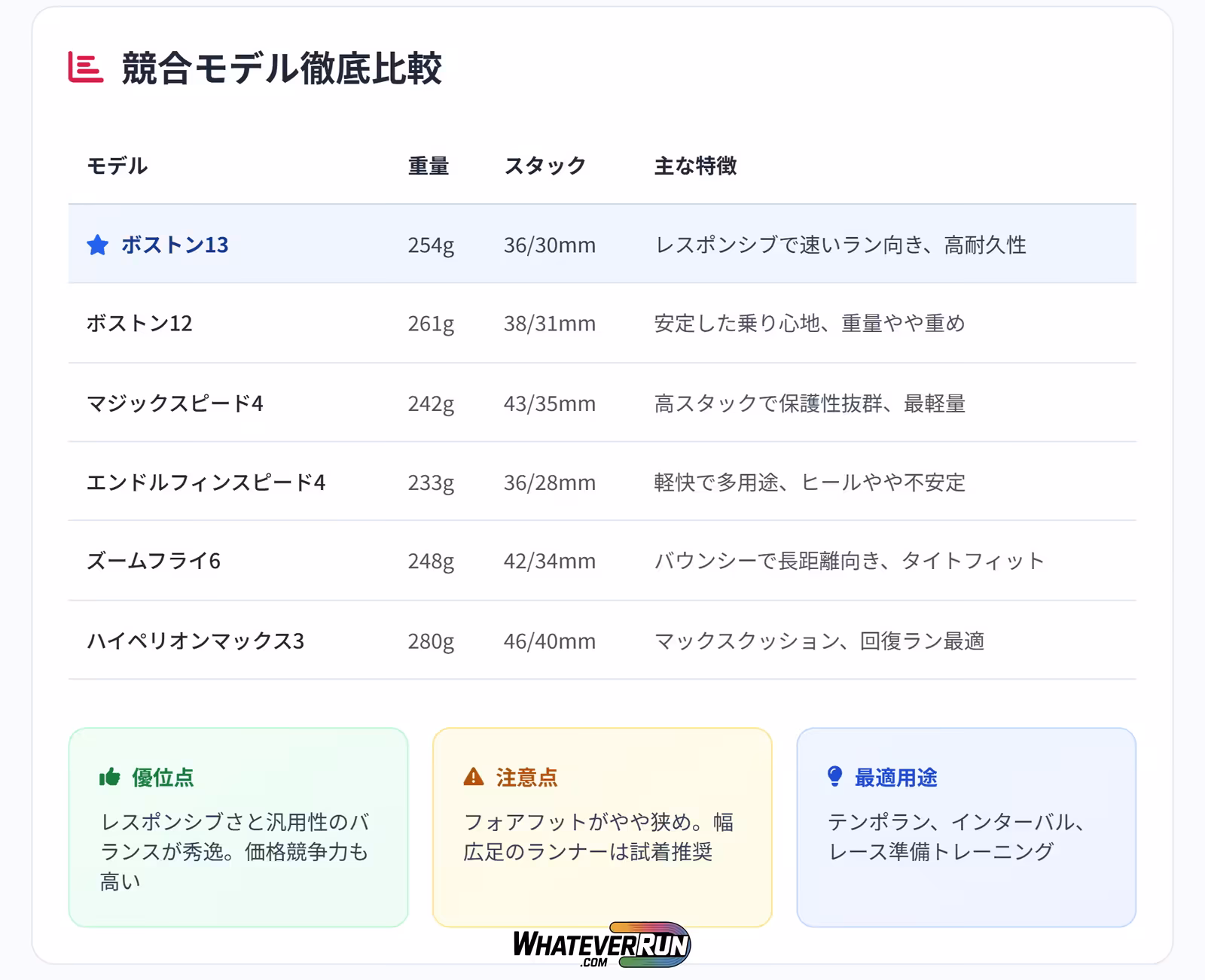 | アディゼロ ボストン13 | ライトストライクプロ主体、36/30mm | レスポンシブで速いラン向き、軽量(254g)、耐久性高 | フォアフット狭め、幅広足に不向き |