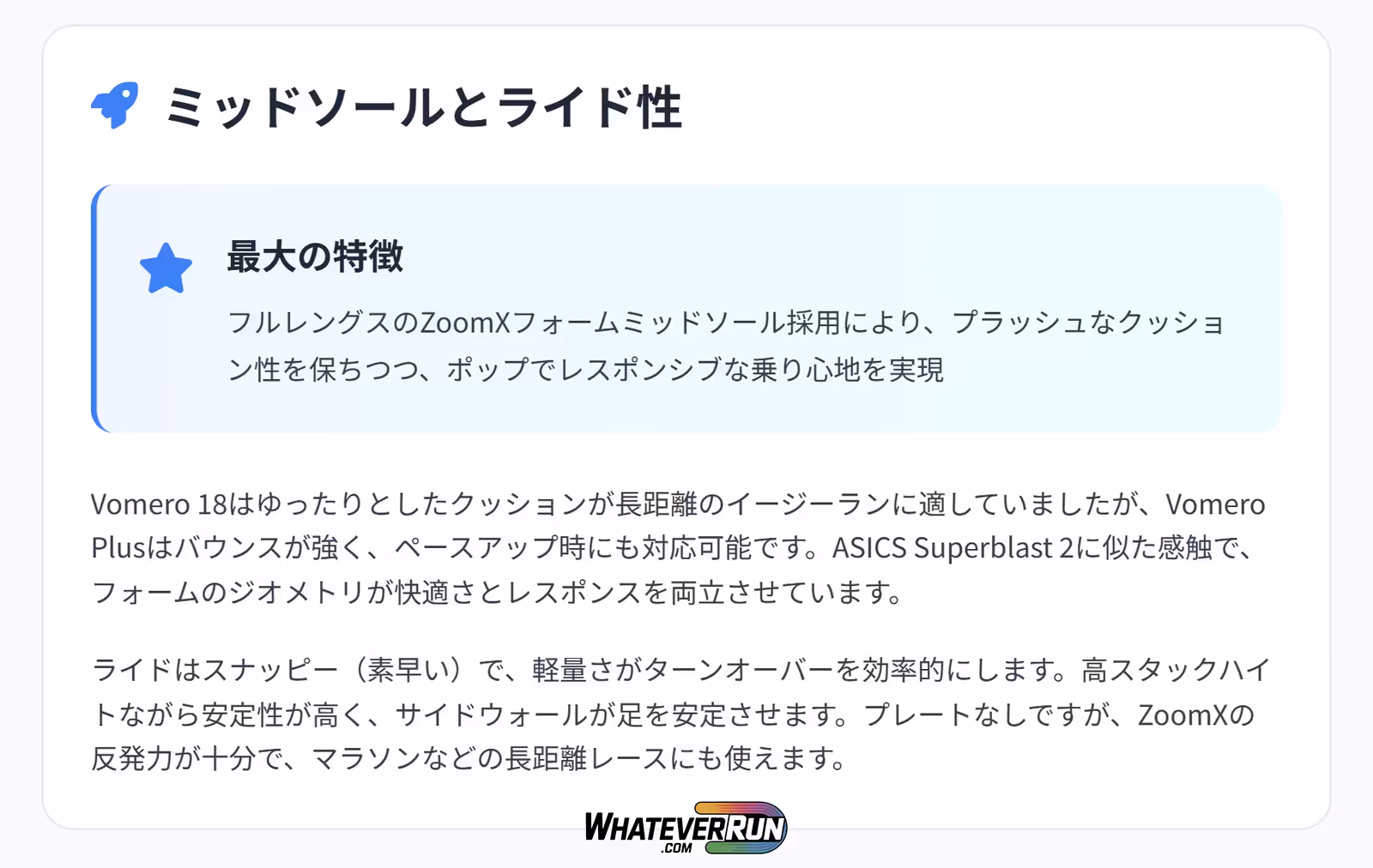 このテーブルから、Vomero PlusがVomero 18の弱点を補い、汎用性を高めたことがわかります。クッションの違いがライドの特性を決定づけています。