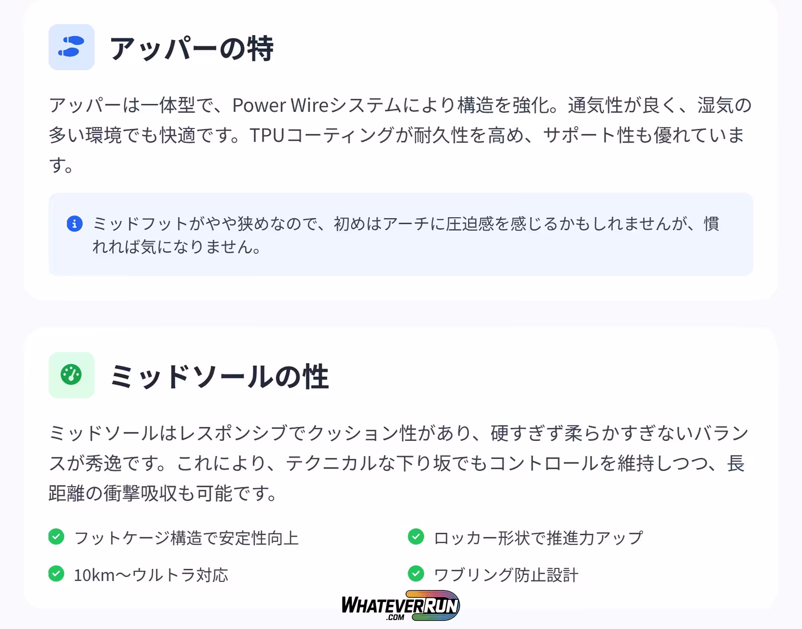 アッパーは一体型で、Power Wireシステムにより構造を強化。通気性が良く、湿気の多い環境でも快適です。TPUコーティングが耐久性を高め、サポート性も優れています。伸縮性のあるタン部分が足にフィットし、クッションが豊富で長時間のランニングでも不快感が少ない点が魅力。一方、ミッドフットがやや狭めなので、初めはアーチに圧迫感を感じるかも知れませんが、慣れれば気になりません。全体として、足を包み込むようなフィット感が得られます。