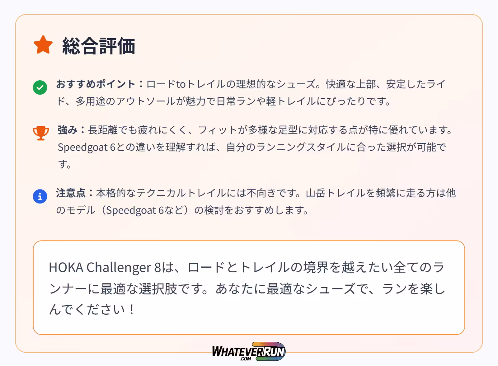 この比較から、Challenger 8はハイブリッド用途に優れ、Speedgoat 6は山岳トレイル向きです。Challenger 7からのアップデートで、ミッドソールの柔らかさとトラクションが強化されています。
