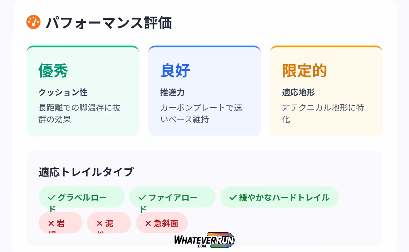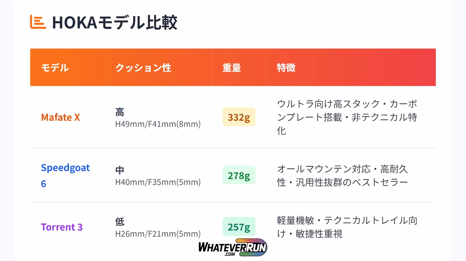 | HOKA Mafate X | 高(ヒール49mm / フォアフット41mm、ドロップ8mm) | 長距離ウルトラで脚温存、カーボンプレートで推進力、通気性良好。重量: 27cmで332g。 | テクニカル地形で不安定、重い、泥地に弱い。 |