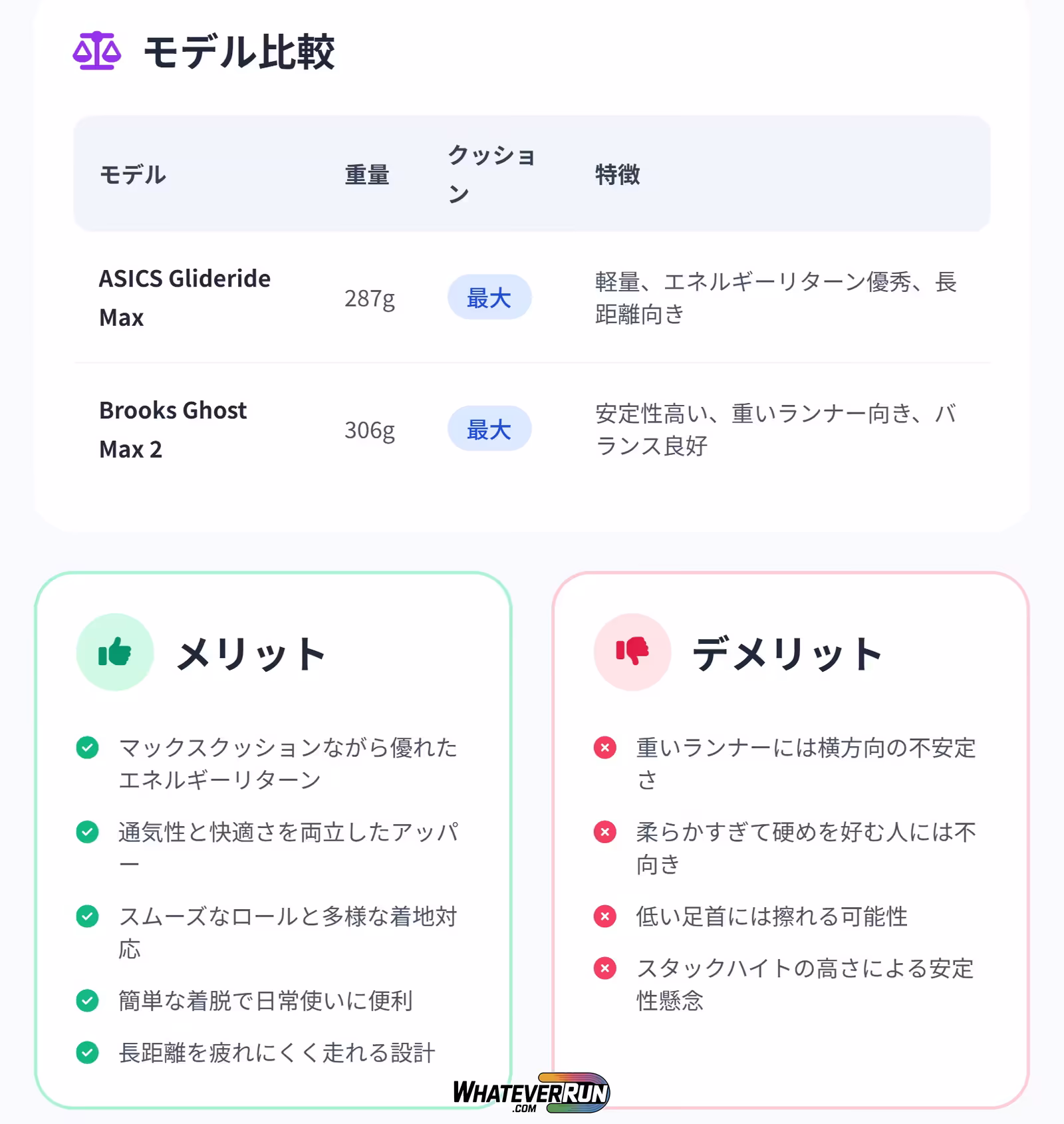| Brooks Ghost Max 2 | 最大 | 似たフィーリングで安定性が高い、重いランナー向き、バランスの良いクッション | 特定の詳細はレビューによるが、Glideride Maxよりやや硬め(推定) |