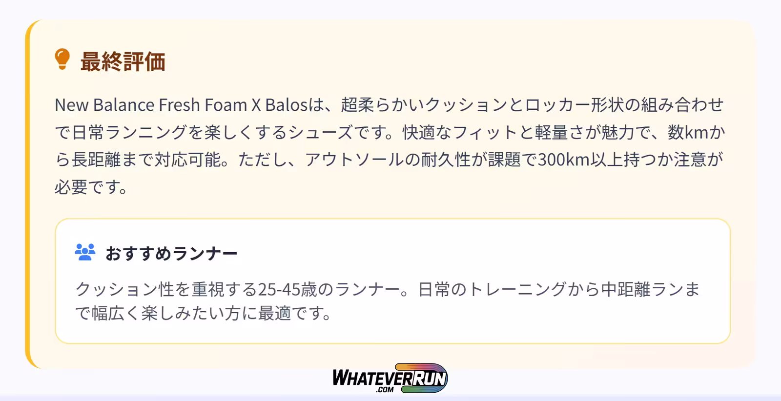 Fresh Foam X Balosを他の人気モデルと比較しました。クッション性、メリット、デメリットを表でまとめます。