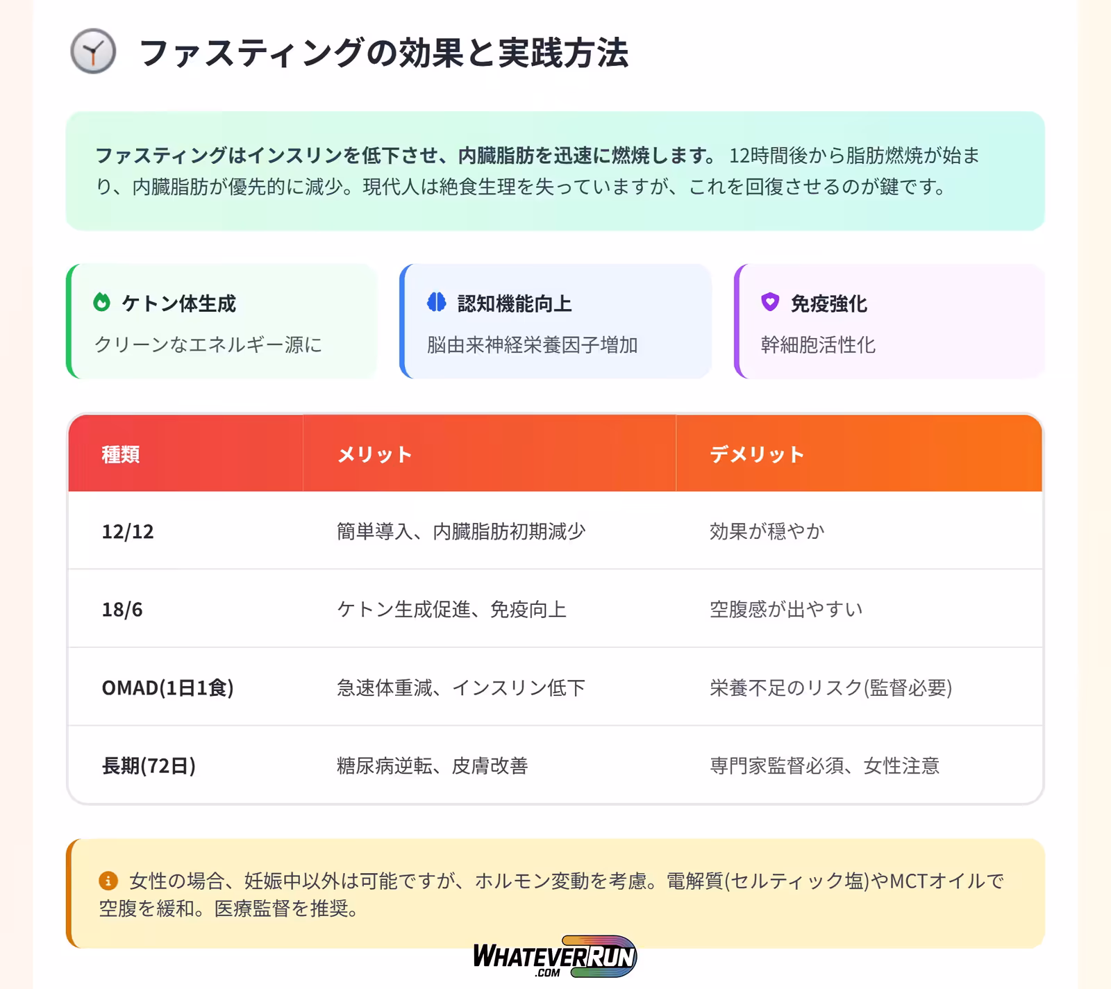 女性の場合、妊娠中以外は可能ですが、ホルモン変動を考慮。電解質(セルティック塩)やMCTオイルで空腹を緩和。医療監督を推奨。