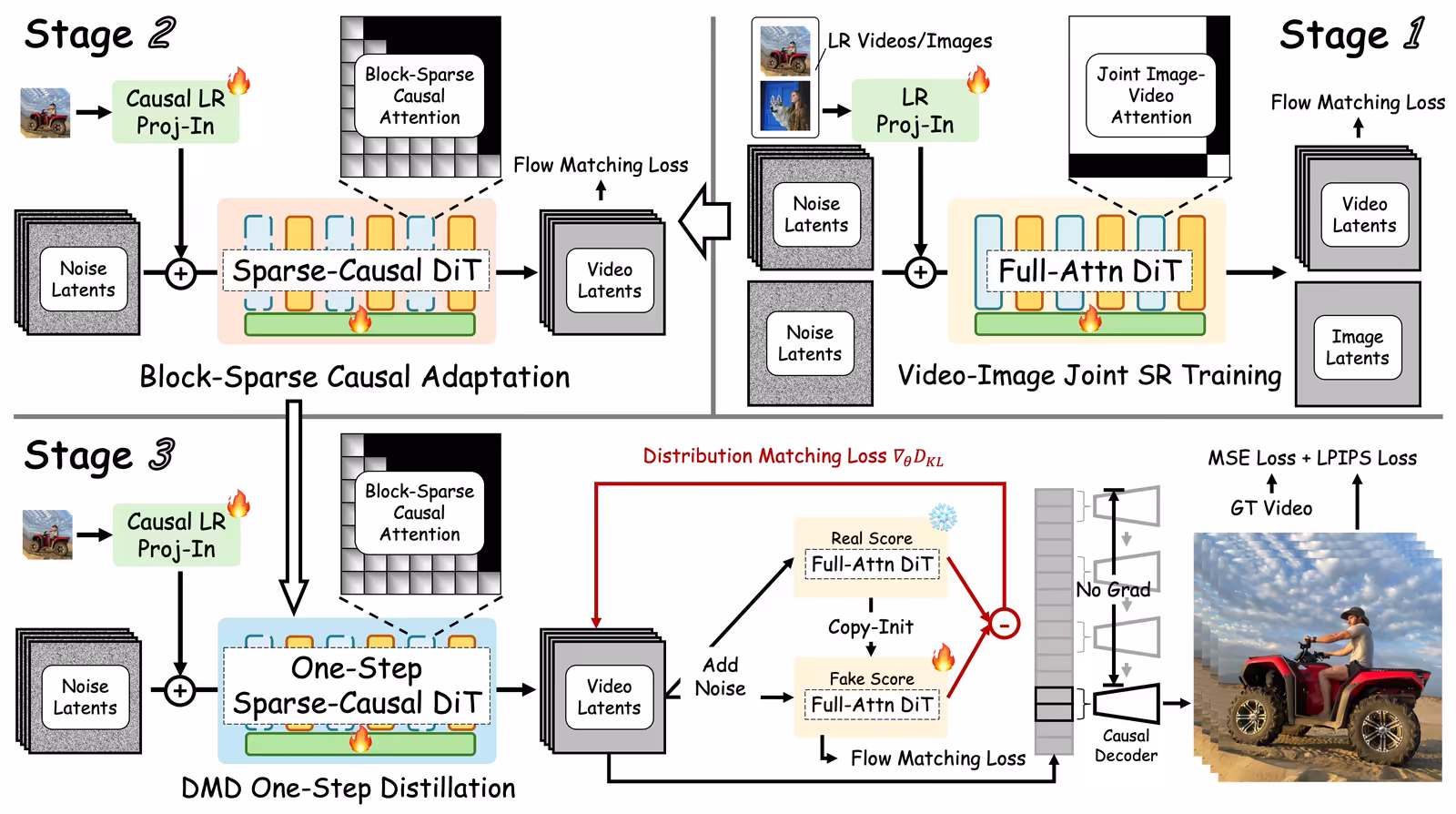 多ステップの拡散を1ステップに圧縮。分布マッチング蒸留(DMD)で、教師モデルから生徒モデルへ知識を移す。- LRフレームとノイズを入力に、並列処理で効率化。