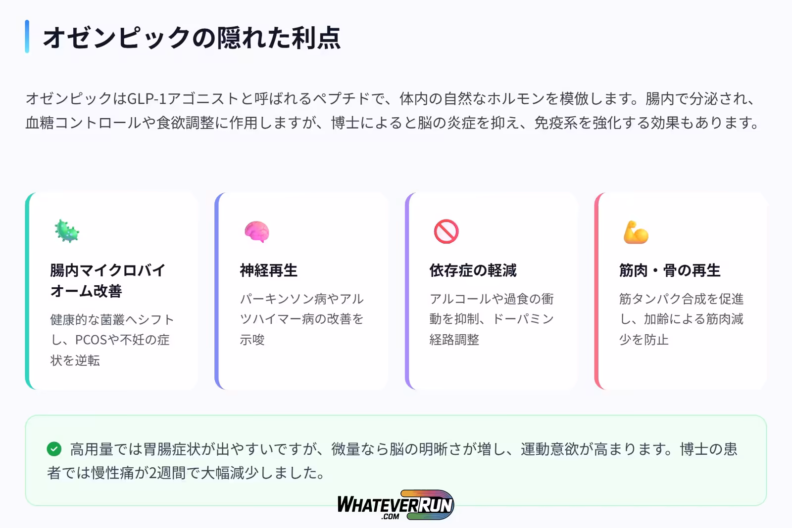 オゼンピックマイクロドーシングは、腸内環境改善や痛み軽減の強力ツールですが、生活習慣が鍵です。筋トレや散歩を習慣化し、医師相談を忘れずに。あなたはどの柱から始めますか? 研究を続け、自身の体に合ったアプローチを探しましょう。健康は旅路、今日から一歩を。