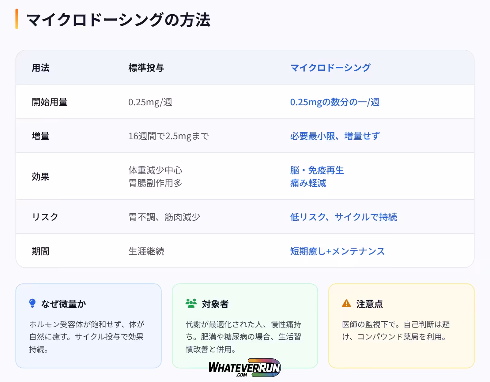 | 開始用量 | 0.25mg/週 | 0.25mgの数分の一/週 |