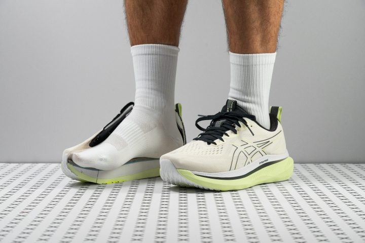 ASICS Glideride Maxは、最大限のクッション性を追求したデイリートレーナーです。ミッドソールにFF Blast Maxフォームを採用し、ヒールスタックが44.1mmと非常に高く、筋肉や関節の保護に優れています。一方でフォアフットスタックは31.4mmで、ドロップは実測12.7mm(ブランド公称6mm)。これはトゥスプリングの影響で、走行時は8-10mm程度に感じられます。