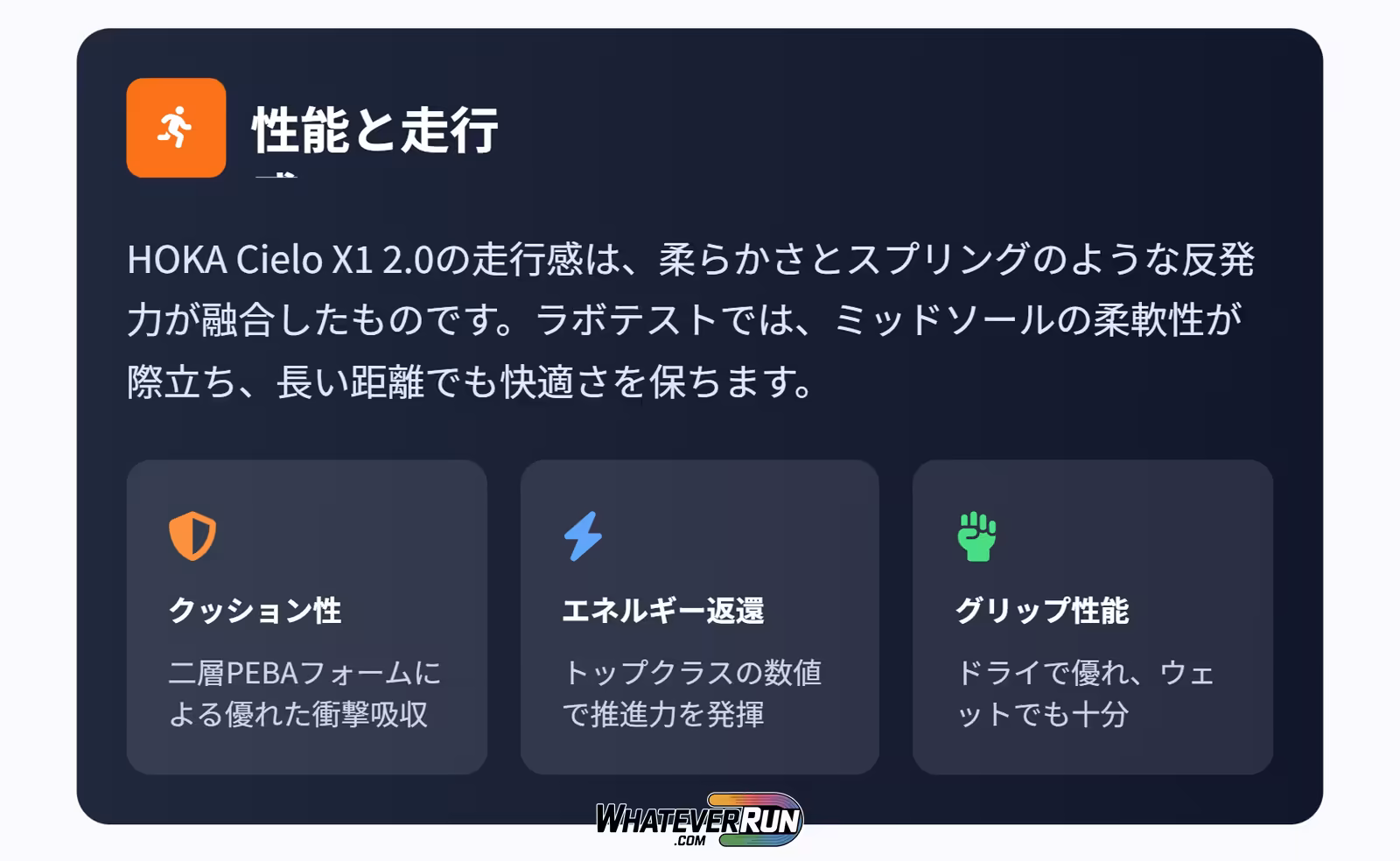 | HOKA Cielo X1 2.0 | 柔らか(13.0 HA)、高いエネルギー返還 | 軽量(208g)、通気性抜群、幅広い距離対応 | ナローフィット、ロッカー強め、低温硬化 |