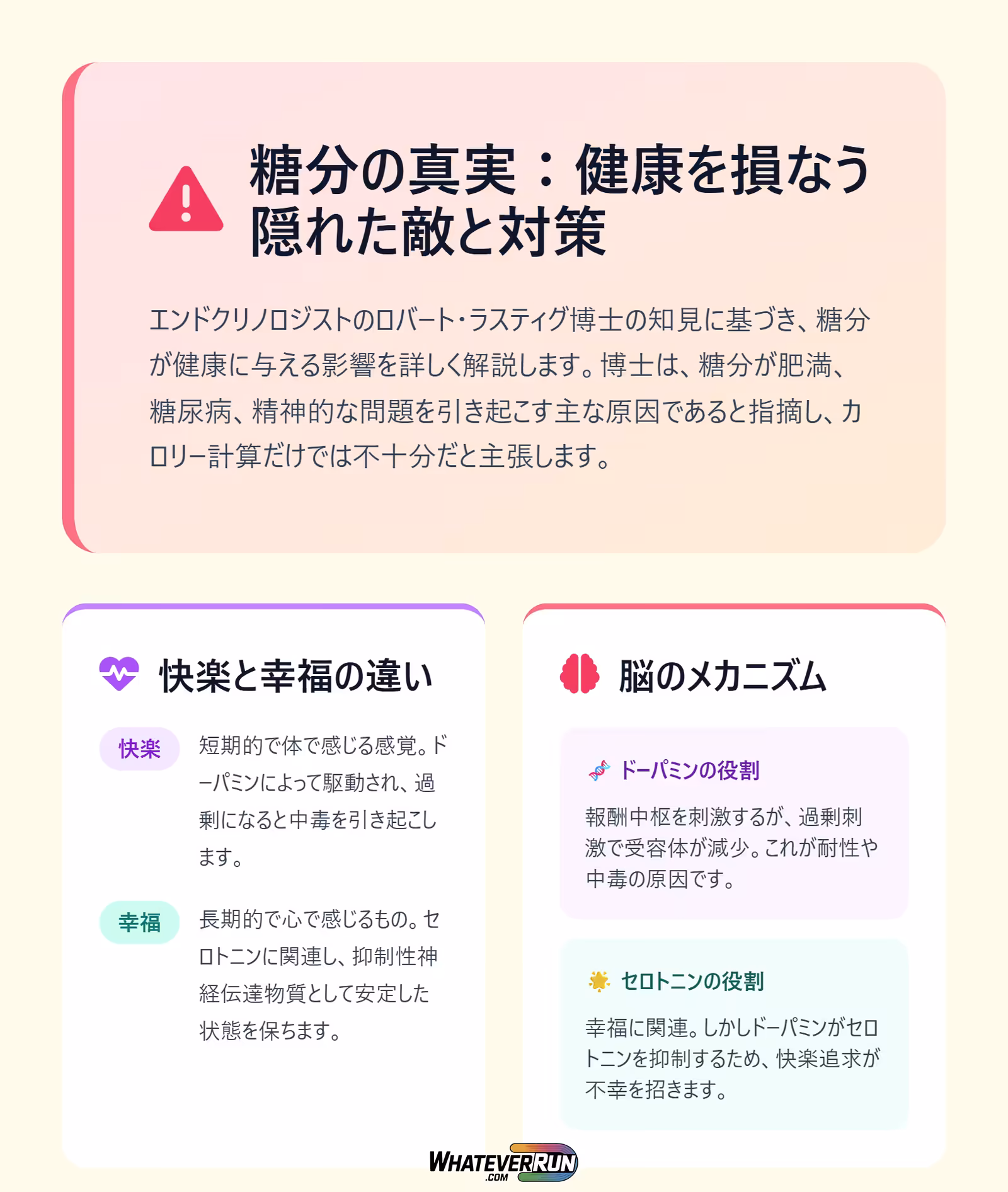 ラスティグ博士は、快楽と幸福を明確に区別します。快楽は短期的なもので、体で感じる感覚です。一方、幸福は長期的なもので、心で感じるものです。快楽はドーパミンによって駆動され、過剰になると中毒を引き起こします。例えば、コカインやニコチン、さらには糖分がこれに該当します。