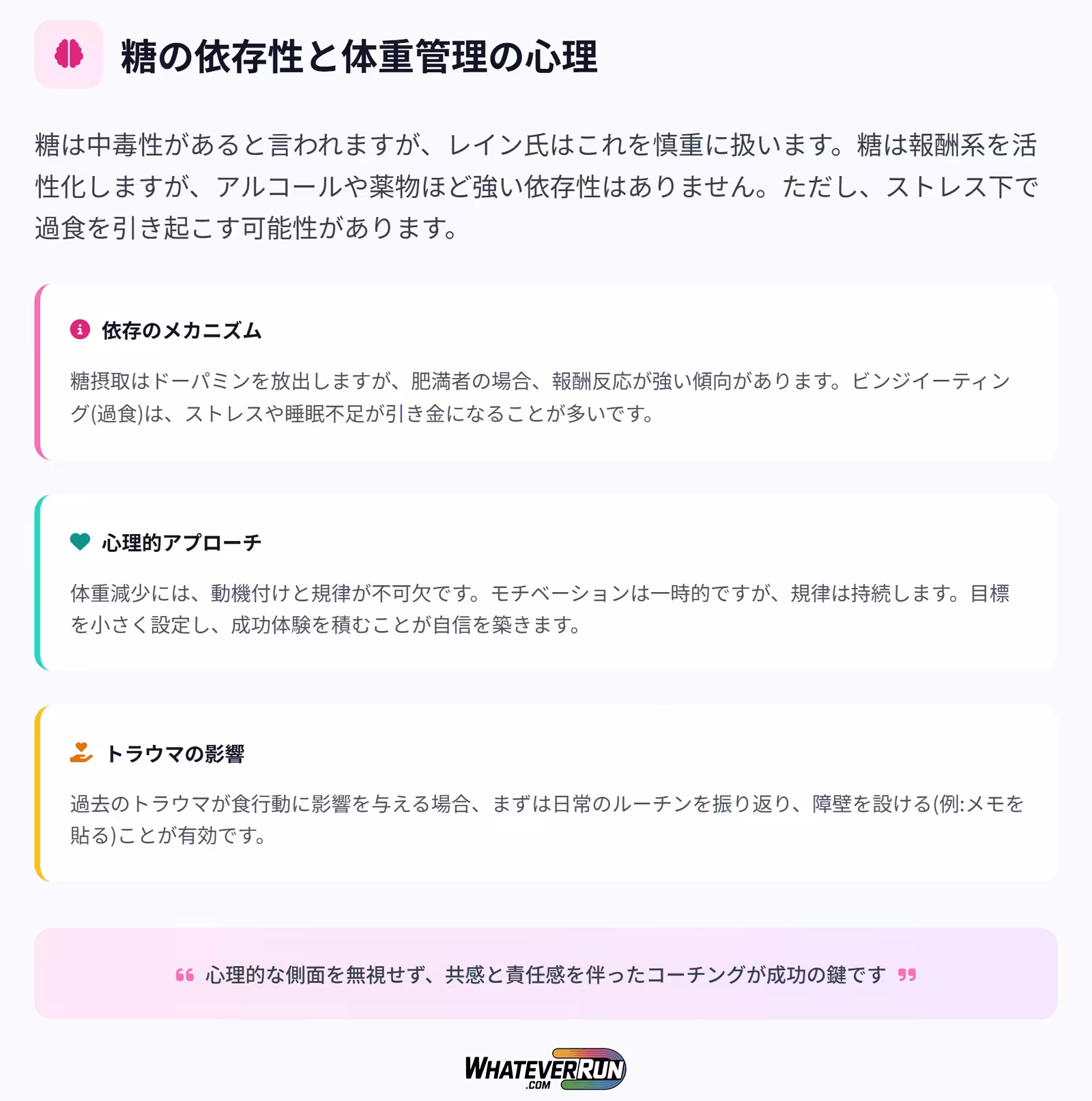 糖は中毒性があると言われますが、レイン氏はこれを慎重に扱います。糖は報酬系を活性化しますが、アルコールや薬物ほど強い依存性はありません。ただし、ストレス下で過食を引き起こす可能性があります。