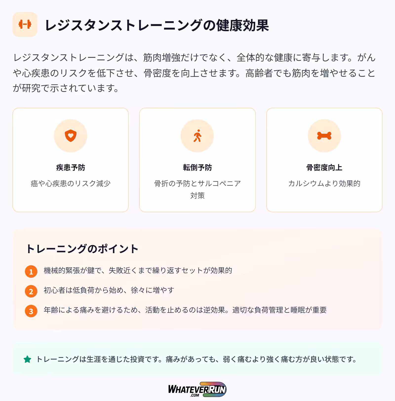 - 加齢と痛み: 年齢による痛みを避けるため、活動を止めるのは逆効果です。適切な負荷管理と睡眠が重要です。