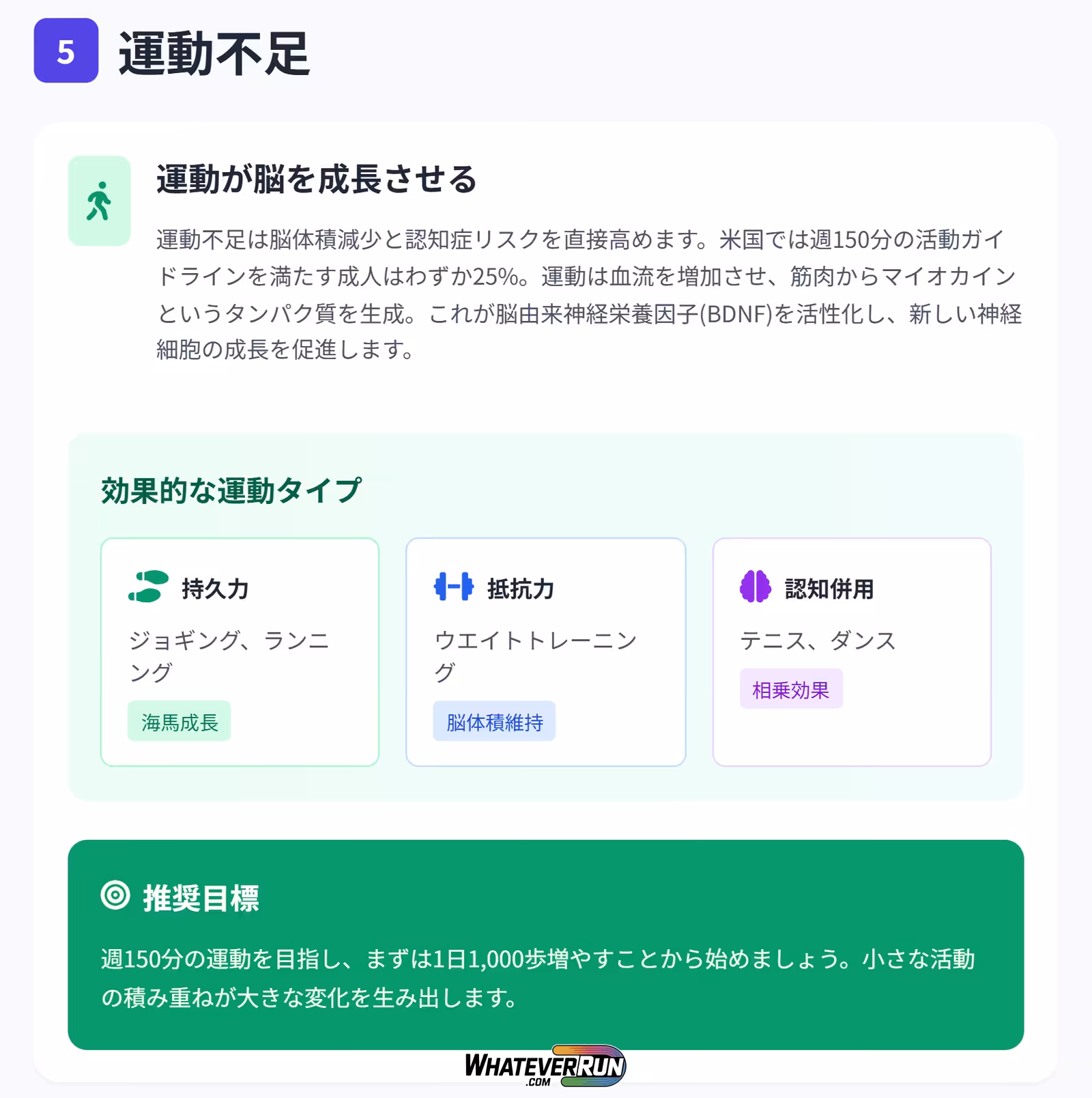 | 持久力(ランニング) | BDNF増加、海馬成長、気分向上。 | 屋外の場合、汚染の影響を受けやすい。 |