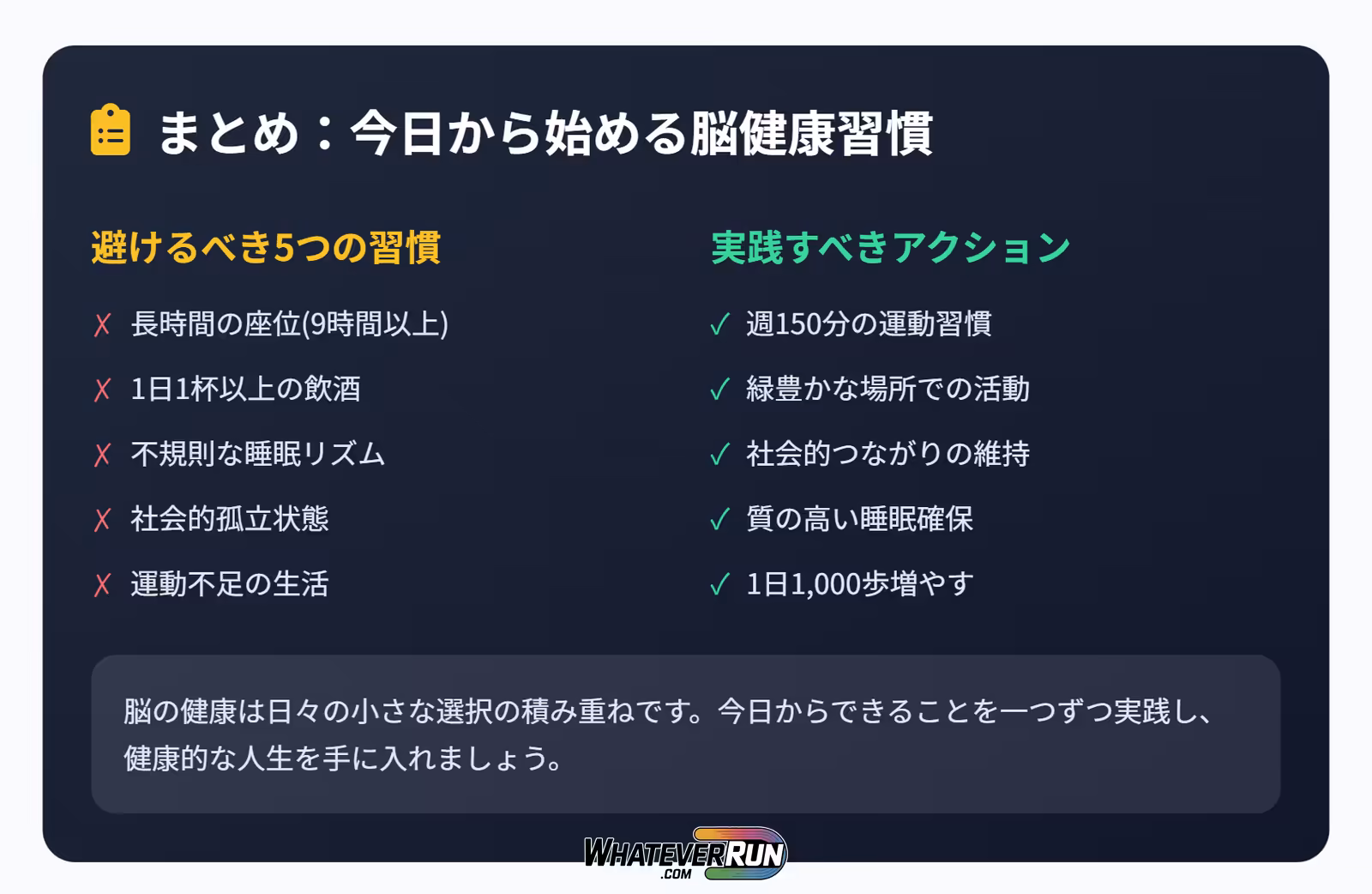 脳の健康を脅かす習慣は、座りすぎ、アルコール過剰、睡眠乱れ、社会的孤立、運動不足の5つです。これらを避け、運動を積極的に取り入れることで、認知症リスクを大幅に低減できます。教授の研究では、小さな活動(例: 散歩)から始めるのが効果的。まずは1日1,000歩増やすだけでも、大きな変化が生まれます。