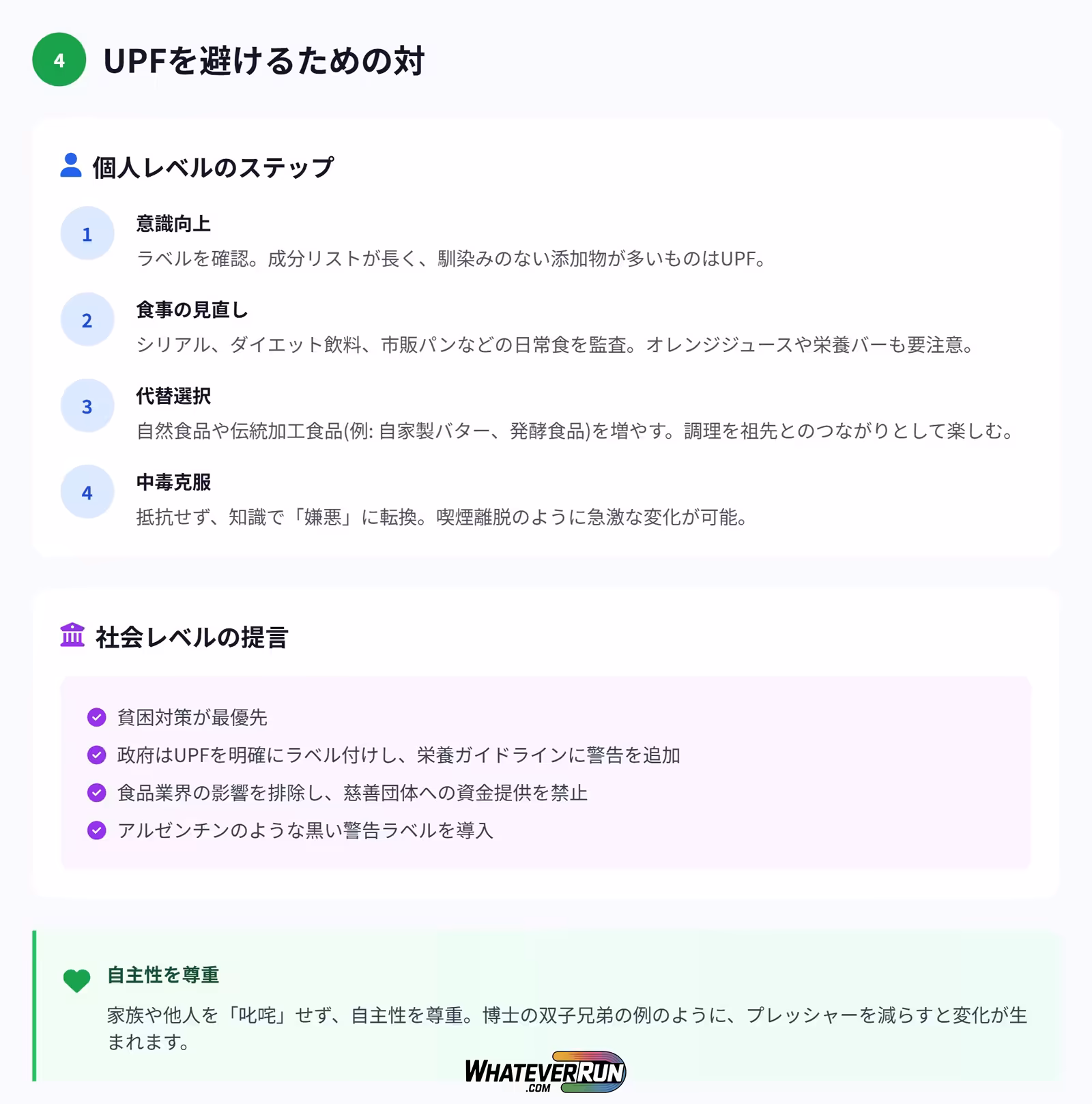 UPFを減らすには、個人レベルの意識改革と社会変革が必要です。博士は「中毒」として扱い、嫌悪感を養うことを推奨します。