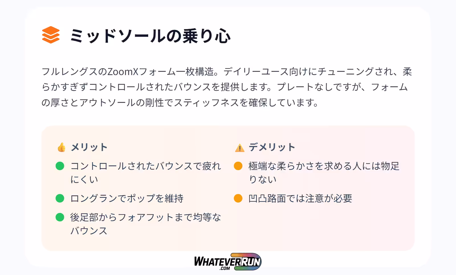 | ナイキボメロプラス | ZoomXフォーム(高密度バウンス) | 快適なフィット、耐久性高くロングラン向き。重量約281gで軽快。 | 高スタックで凹凸路面に注意が必要。 |