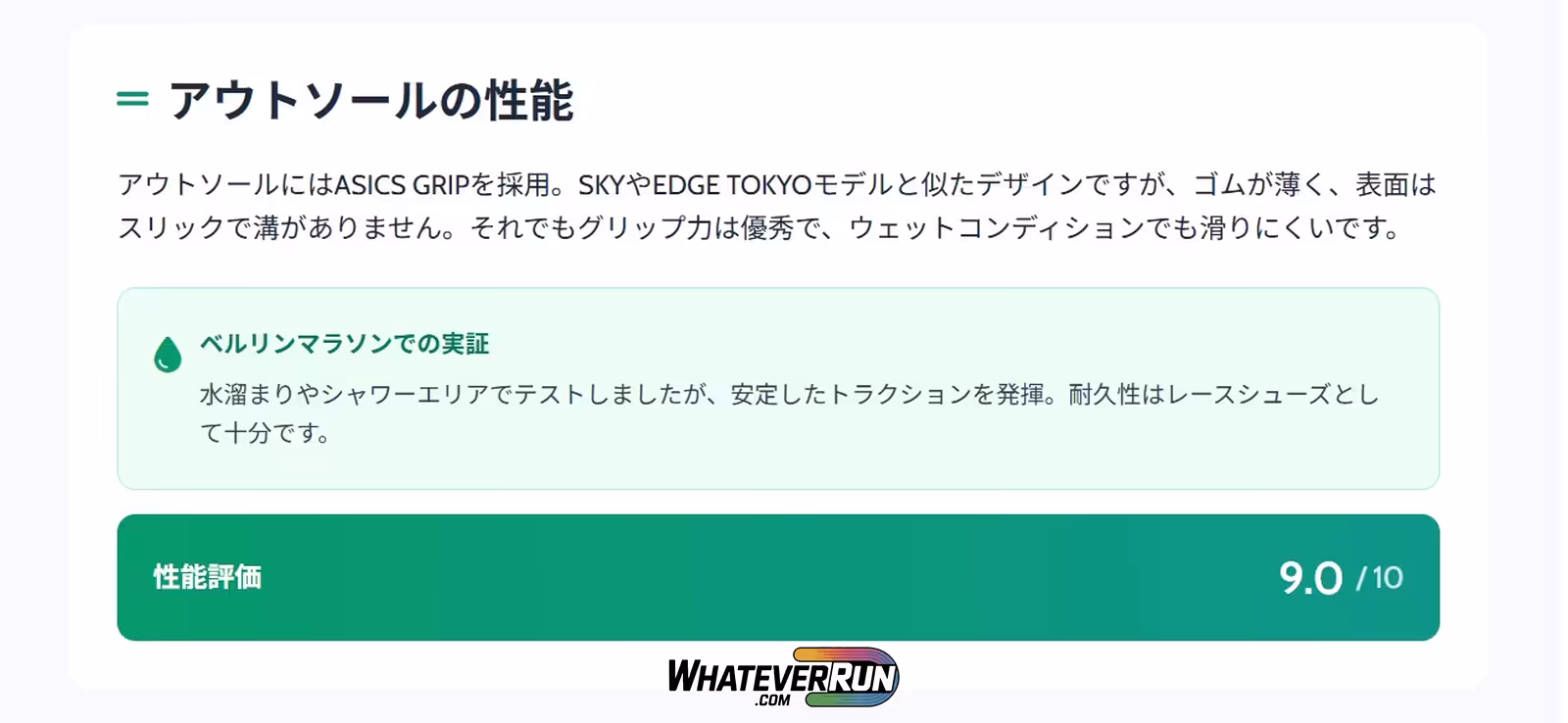 ベルリンマラソンでの水溜まりやシャワーエリアでテストしましたが、安定したトラクションを発揮。耐久性はレースシューズとして十分ですが、他のスーパーシューズに比べて長持ちしない可能性があります。性能面では9/10点。