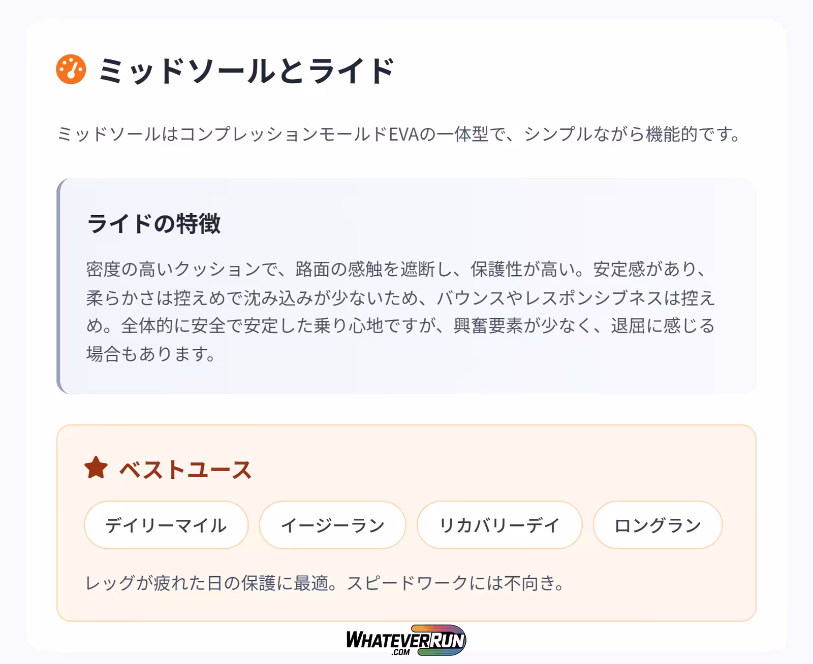 - ベストユース: デイリーマイル、イージーラン、リカバリーデイ。レッグが疲れた日の保護に最適。ロングランも可能ですが、スピードワークには不向き。