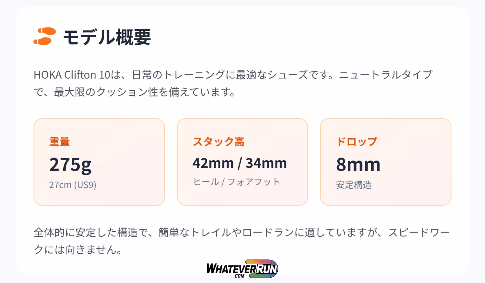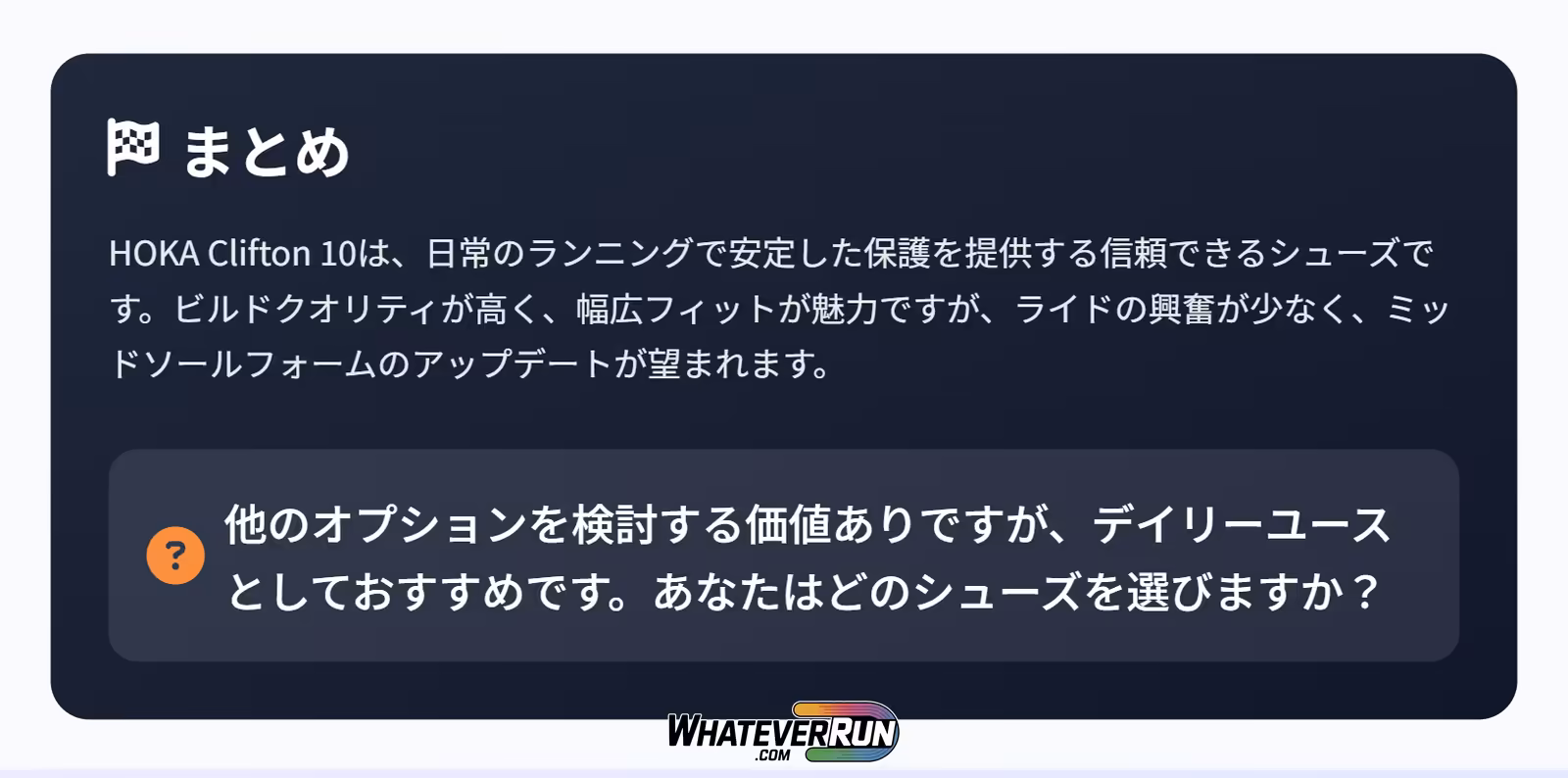 | HOKA Clifton 10 | 密度高く安定 | 軽量で耐久性高く、幅広フィットで快適 | バウンス不足でライドが単調、濡れ路面グリップ弱 |
