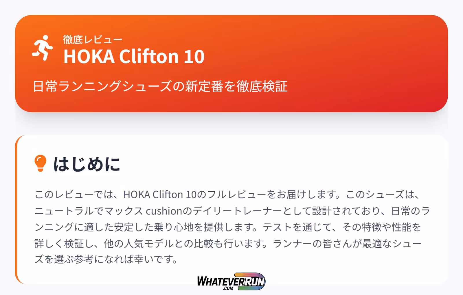 このレビューでは、HOKA Clifton 10のフルレビューをお届けします。このシューズは、ニュートラルでマックス cushionのデイリートレーナーとして設計されており、日常のランニングに適した安定した乗り心地を提供します。テストを通じて、その特徴や性能を詳しく検証し、他の人気モデルとの比較も行います。ランナーの皆さんが最適なシューズを選ぶ参考になれば幸いです。