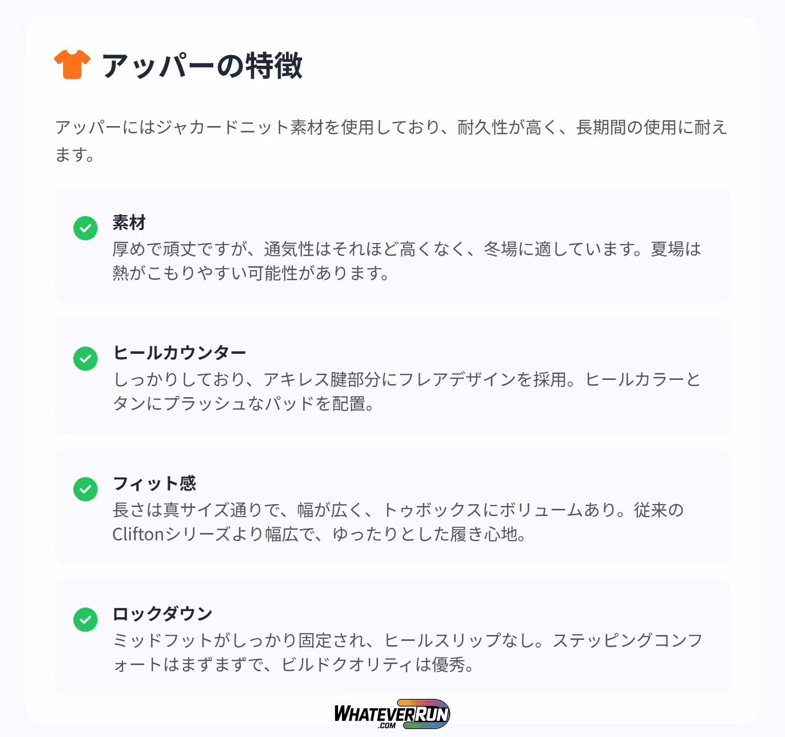 - フィット感: 長さは真サイズ通りで、幅が広く、トゥボックスにボリュームあり。従来のCliftonシリーズより幅広で、ゆったりとした履き心地。