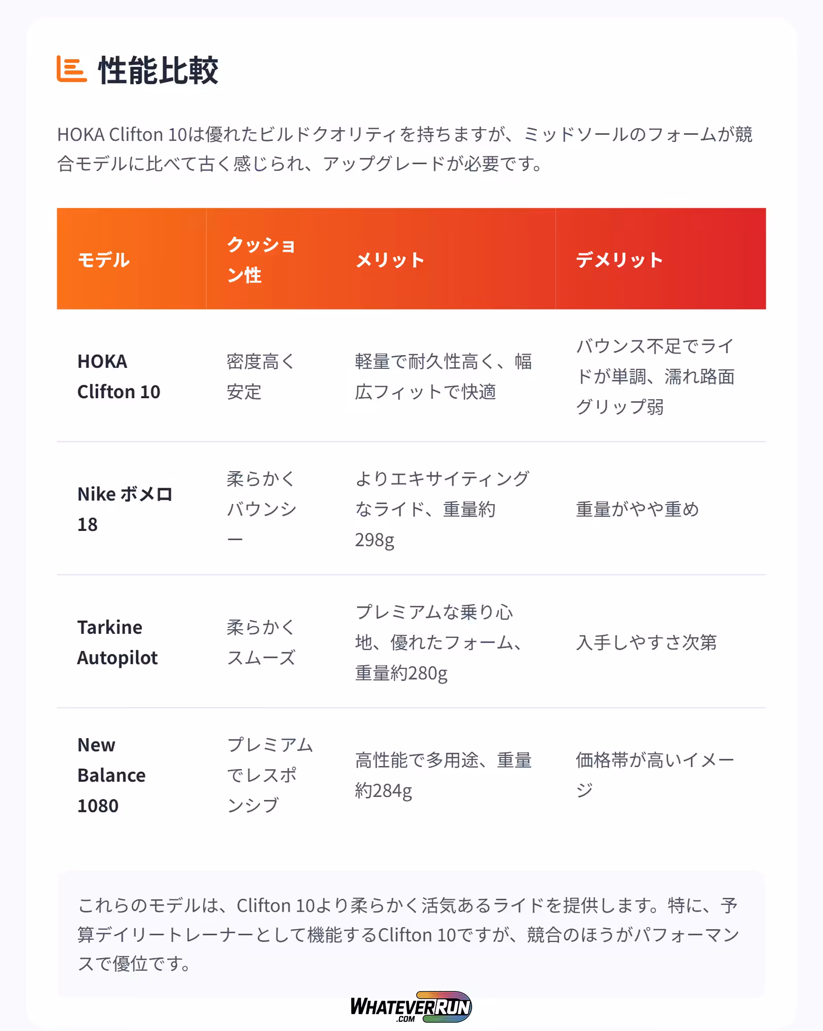 HOKA Clifton 10は優れたビルドクオリティを持ちますが、ミッドソールのフォームが競合モデルに比べて古く感じられ、アップグレードが必要です。ここでは、他のデイリートレーナーと比較します。