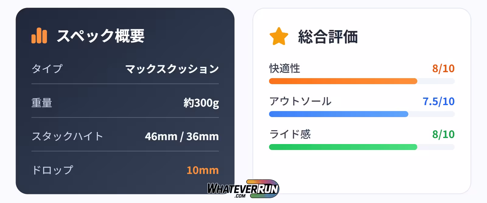 | ニューバランス フレッシュフォームX モア v5 | マックス(フレッシュフォームX) | ボメロ同様のソフトバウンス、低ドロップ4mmで自然な走り | ドロップが低いため調整が必要、スタック高めで重い |