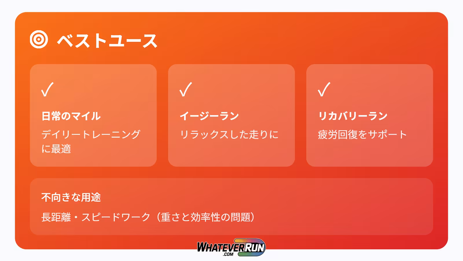 ただし、バウンスが上下方向中心で、前方推進力が弱く、効率性が低いのが欠点です。1時間以上のランでは重さが目立ち、エネルギーを消耗します。全体のライド評価は8/10。ベストユースは日常のマイル、イージーラン、リカバリーランで、長距離やスピードワークには不向きです。