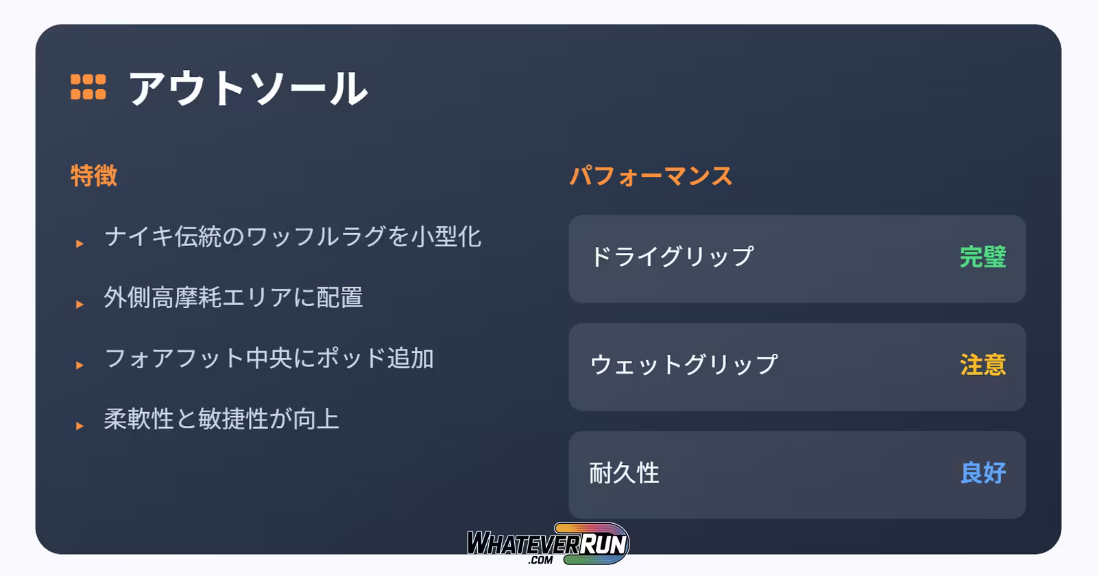 アウトソールは、ナイキ伝統のワッフルラグを小型化し、外側の高摩耗エリアに配置しています。また、フォアフットの中央にポッドを追加し、柔軟性と敏捷性を向上させました。これにより、前モデルよりフォアフットが柔らかく感じられます。
