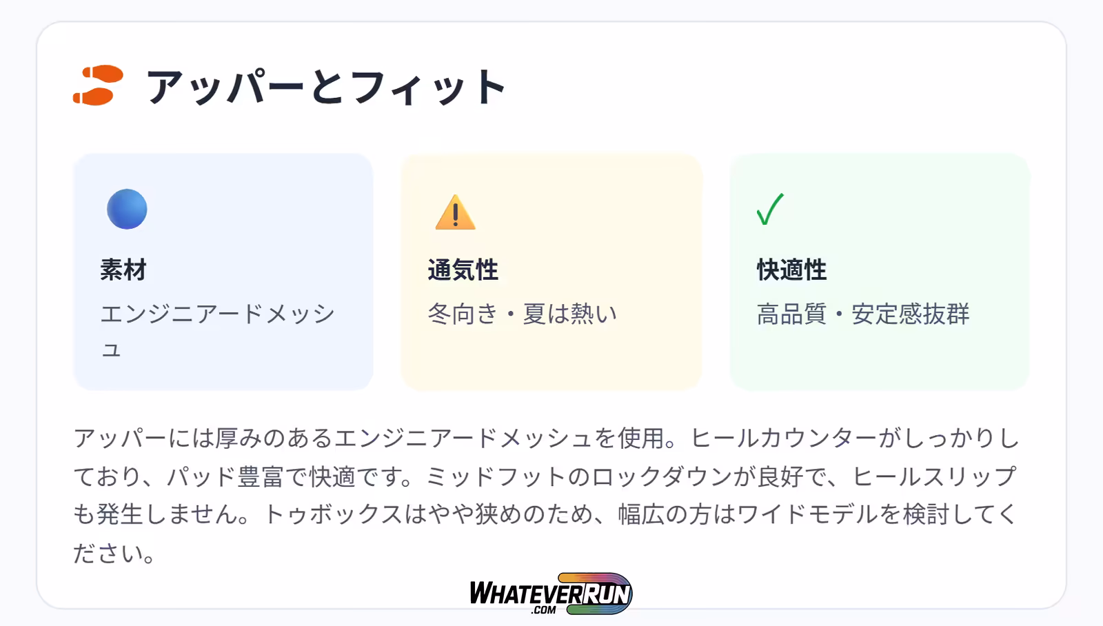 フィット感については、長さは真のサイズ通りですが、トゥボックスがやや狭いため、幅広の方はワイドモデルかハーフサイズアップを検討してください。全体のビルドクオリティは高く、快適性は抜群ですが、暑さのため8/10の評価です。