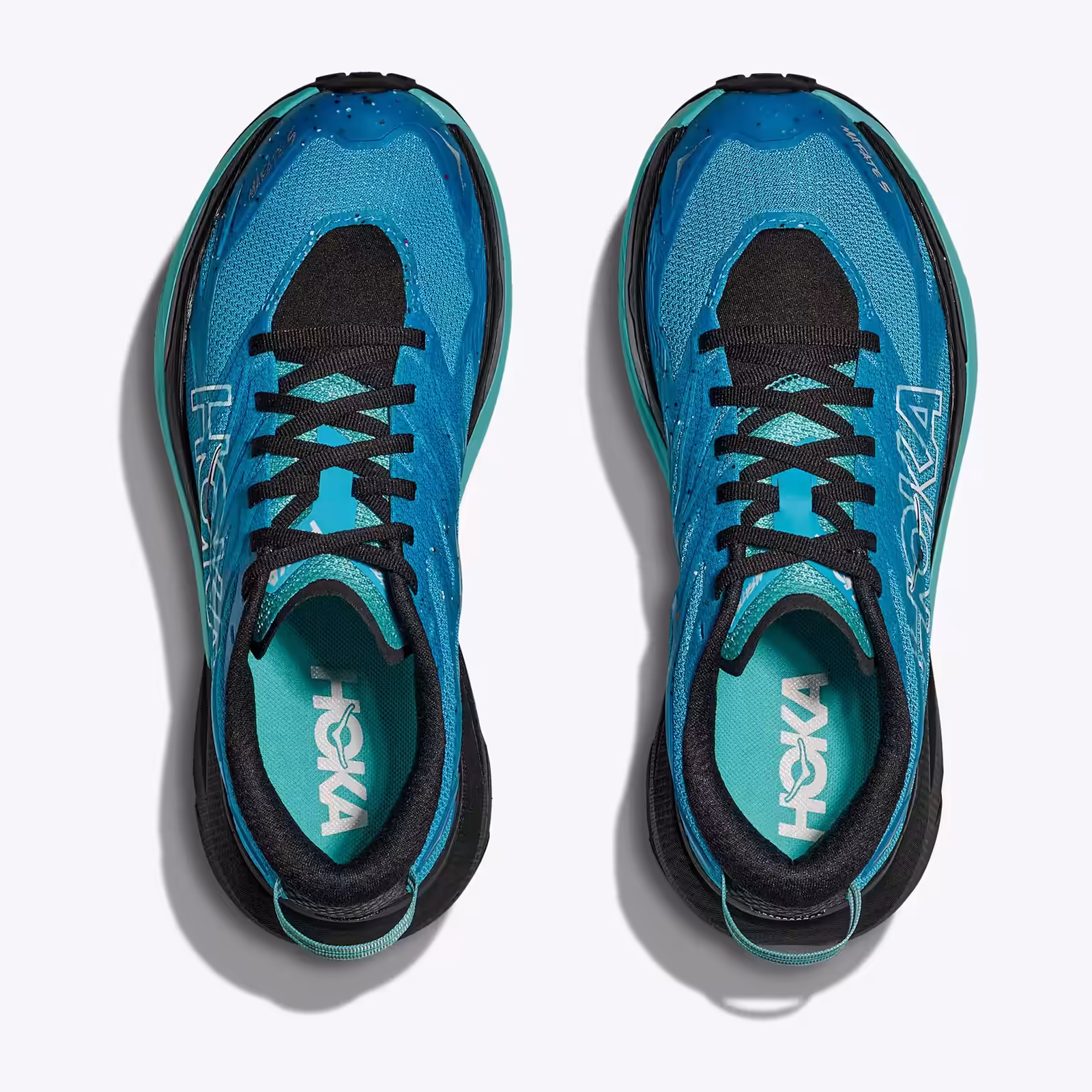 HOKA Mafate 5は、トレイルランニングの長距離モデルとして、最大のクッションを重視した設計が特徴だ。スタックハイトはヒール部で43mmから45mm、フォアフット部で35mmから37mm程度とされ、ドロップは8mmに設定されている。重量は27cm(US9)サイズで315gと、ボリュームのあるシューズとしては標準的である。このシューズは、柔軟な乗り心地を保ちつつ、地形の変化に対応する安定性を備えており、ウルトラディスタンスのランナーに向いている。従来のMafateシリーズから進化を遂げ、より高いスタックとデュアルフォームシステムを導入することで、快適さを向上させている。レビュアーたちは、この変化がシリーズのファンに意見を分ける可能性を指摘しつつ、新たなバランスがもたらす利点を評価している。全体の構造は、トレイルの厳しい条件で耐久性を発揮するよう工夫されており、日常のトレーニングから本格的なレースまで幅広い用途を想定している。