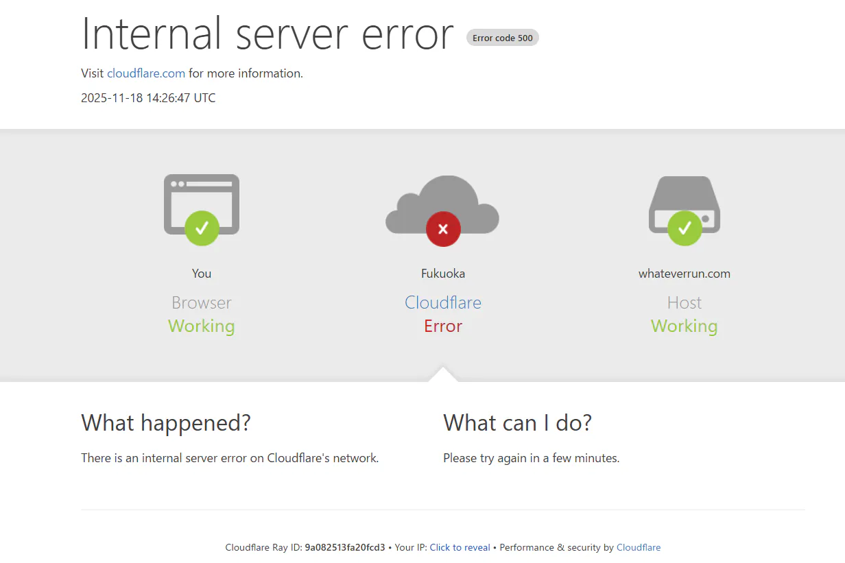 2025年11月18日(日本時間20:20頃)、インターネットインフラの中核を担うCloudflareで大規模なネットワーク障害が発生し、世界中のウェブサイト・サービスが一時的にアクセス不能となりました。ユーザーにはCloudflare由来のエラーページが表示され、多くのプラットフォームでHTTP 5xxエラーが急増する事態に発展しました。