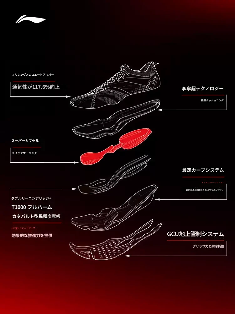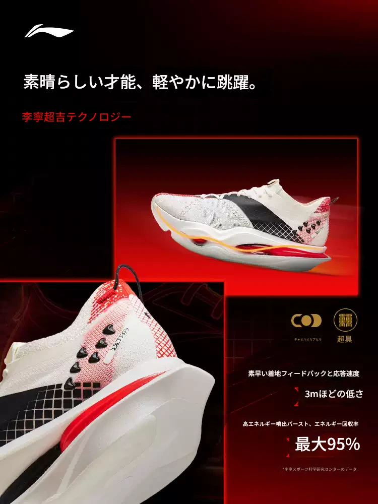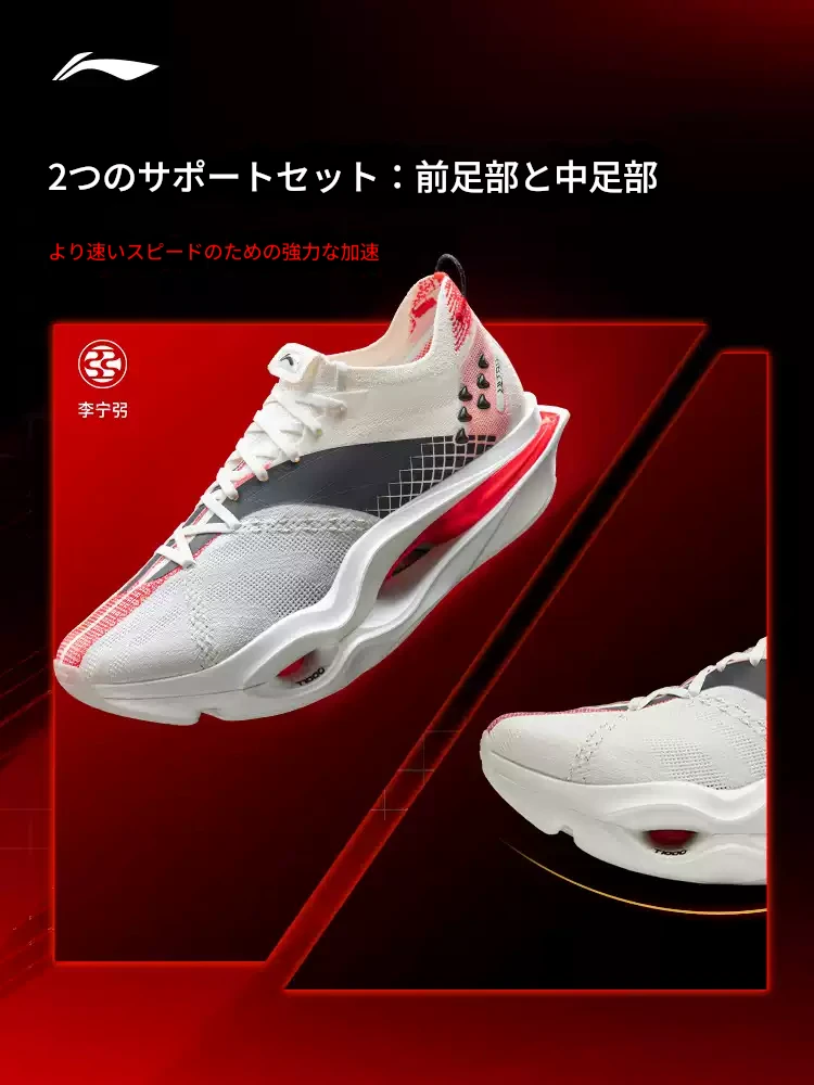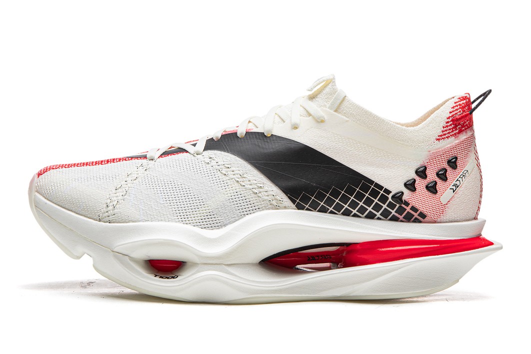 The Feidian 6U stands at the pinnacle of Li-Ning’s running technology. The midsole features Super Boom supercritical foam material, boasting a high energy return rate that efficiently converts landing energy into propulsion. The upper adopts Boom Fiber, creating a lightweight and highly breathable structure. Weighing approximately 196g per shoe, it is remarkably light. The structured carbon plate provides zoned rigidity that aligns with foot movement through its 3D structure, delivering explosive propulsion in the forefoot. Additionally, GCU and DYNAMIC FOOT ARCH technologies enhance stability, enabling adaptation to various surfaces. These technologies were the result of maximizing performance under the initial regulations, and reviews praise its overwhelming sense of speed. However, the addition of new rules led to the structured plate being interpreted as an additional rigid structure, resulting in non-compliance. In everyday use, these advantages are fully realized, contributing significantly to runners’ performance improvement.