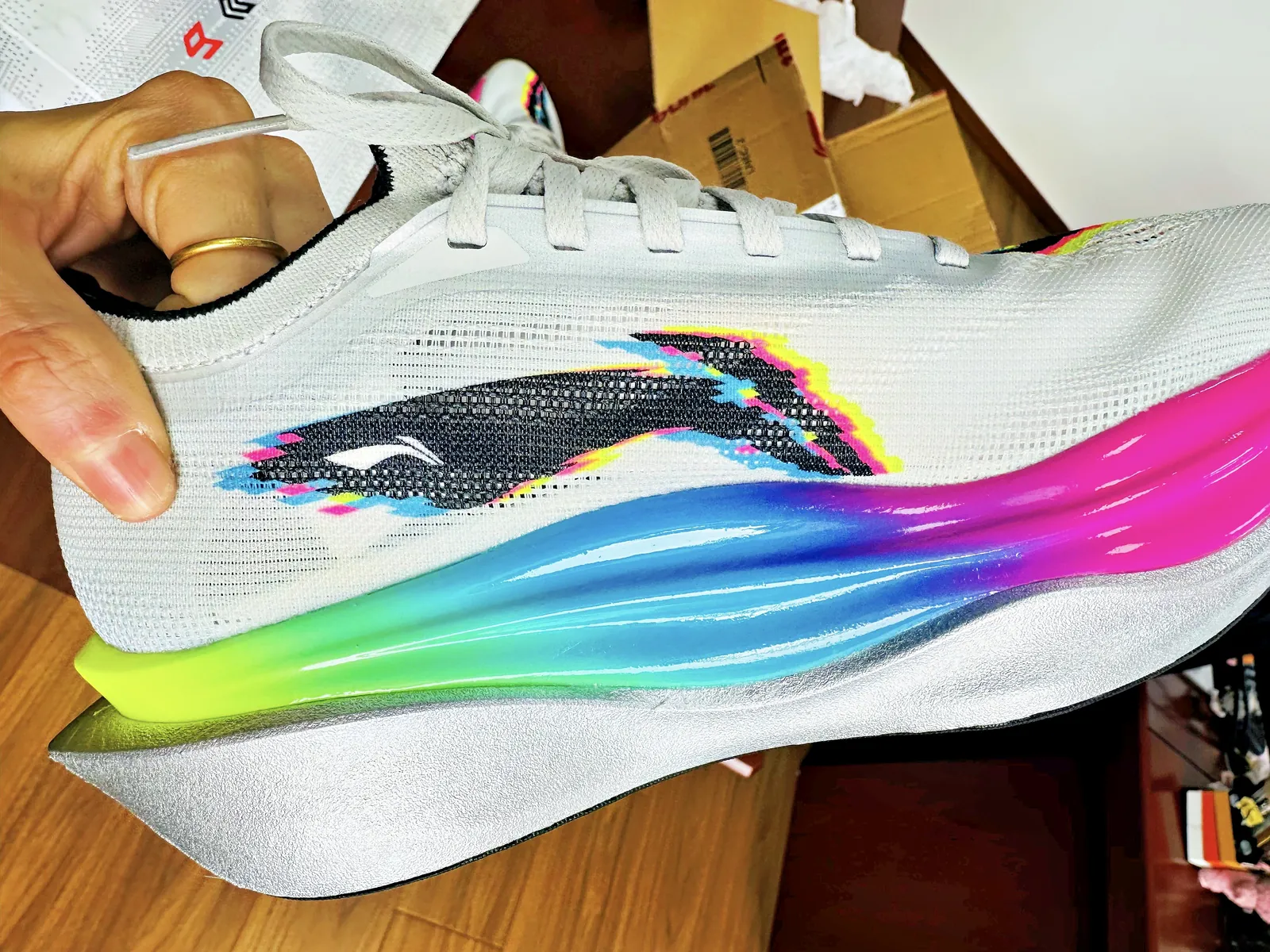 この技術は、リーニンの独自開発で、PEBAベースのフォームを進化させたものだ。業界ではPEBAフォームが主流だが、空気封入による追加の反発は差別化ポイントとなる。安定性とのトレードオフはあるものの、平坦コースでの効率性は抜群だ。