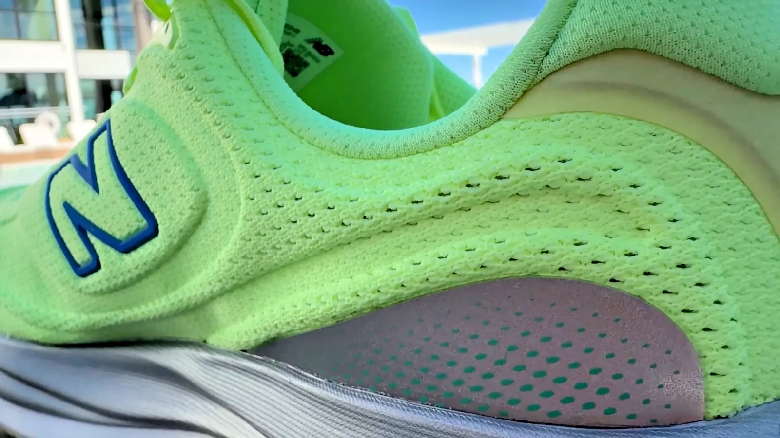 1080v15の最大の特徴は、ミッドソールの素材変更にある。従来のFresh Foam Xを廃し、 INFINION(インフィニオン )フォームを採用したことで、軽量性と反発力が向上した。このフォームはスーパークリティカル製法により、レスポンシブで耐久性が高いとされ、レビューでは約64kmの使用後も新品のような感触を維持している点が指摘されている。アッパーはパーフォレーテッドメッシュで、通気性を確保しつつ構造的な厚みを部分的に変えることで、足のホールドを強化。ヒールカウンターは硬質でスリップを防ぎ、舌部はガセット付きで安定感を提供する。アウトソールは厚めのラバー配置で耐久性を保ちつつ、露出フォーム部分が軽量化に寄与している。これらの要素が組み合わさることで、v15はデイリートレーナーとして多様なペースに対応する汎用性を備えている。